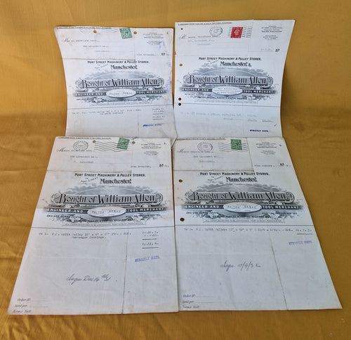 4 x Vintage Paper Ephemera, handwritten & typewritten invoices, Port Street Machinery and Pulley Sto