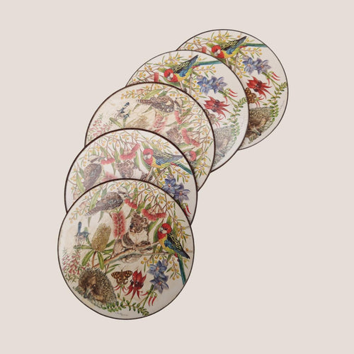 5 x Vintage cork back round coasters for mugs glass or cups birds flowers badger butterflies design