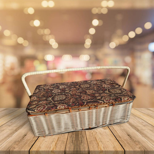 Vintage Tapestry Wicker Woven Sewing Box Basket Pin Cushion Satin Interior