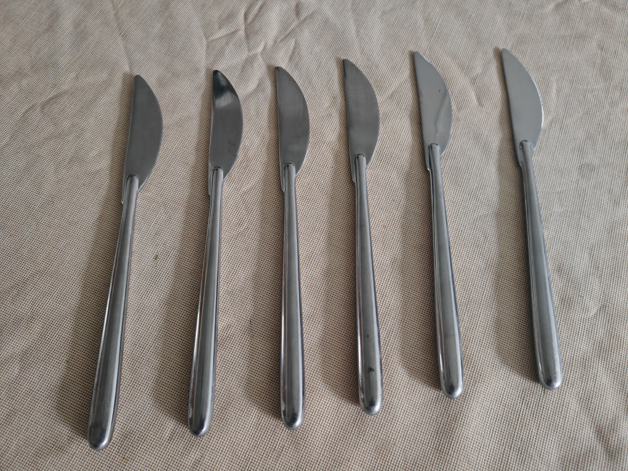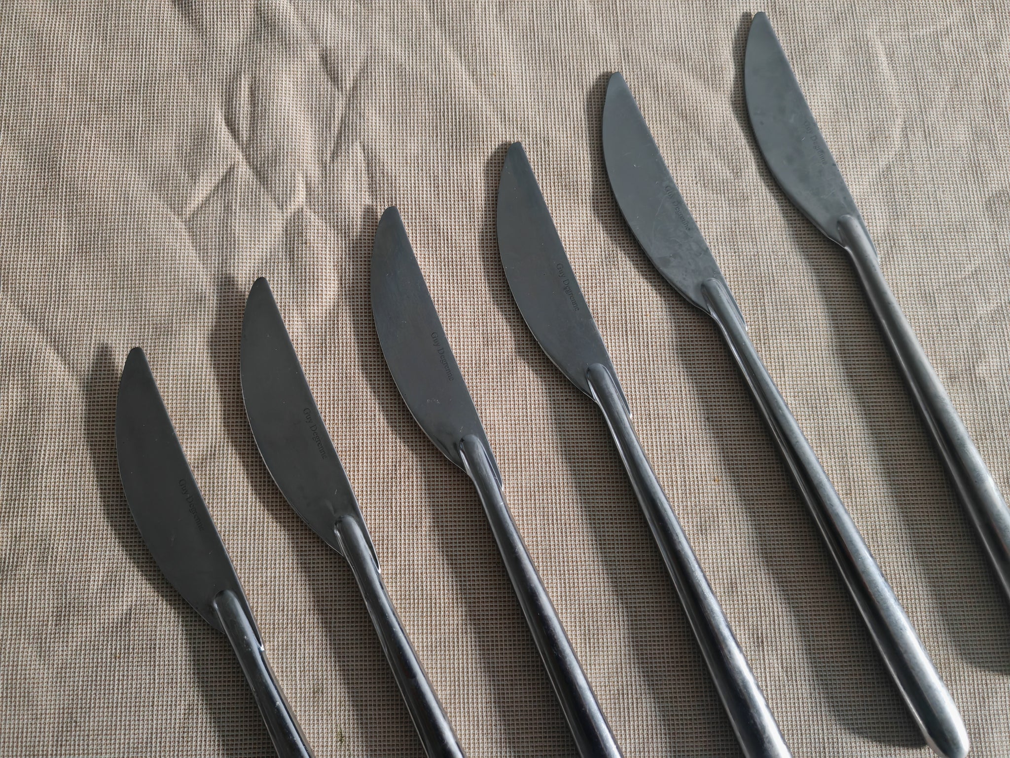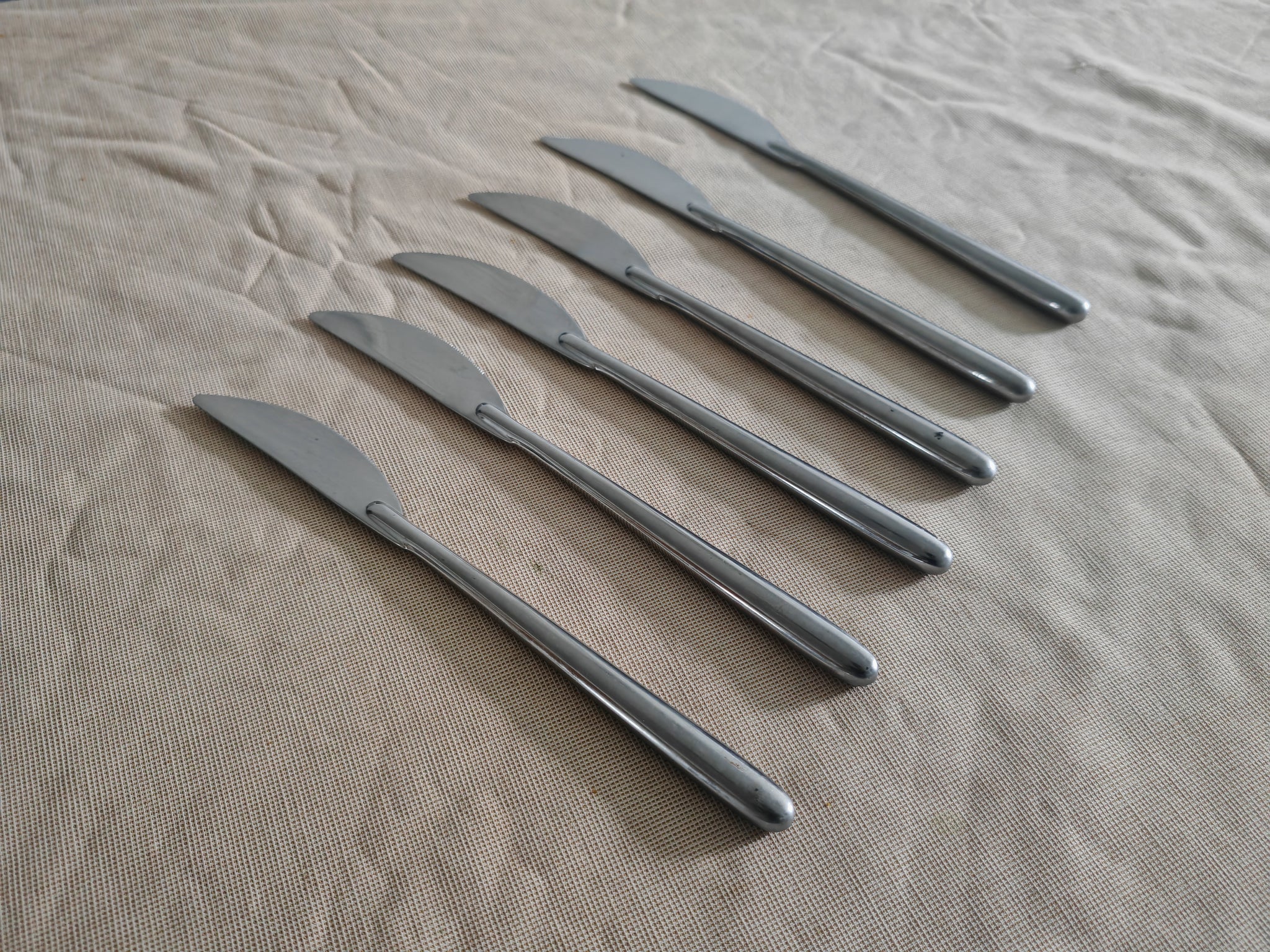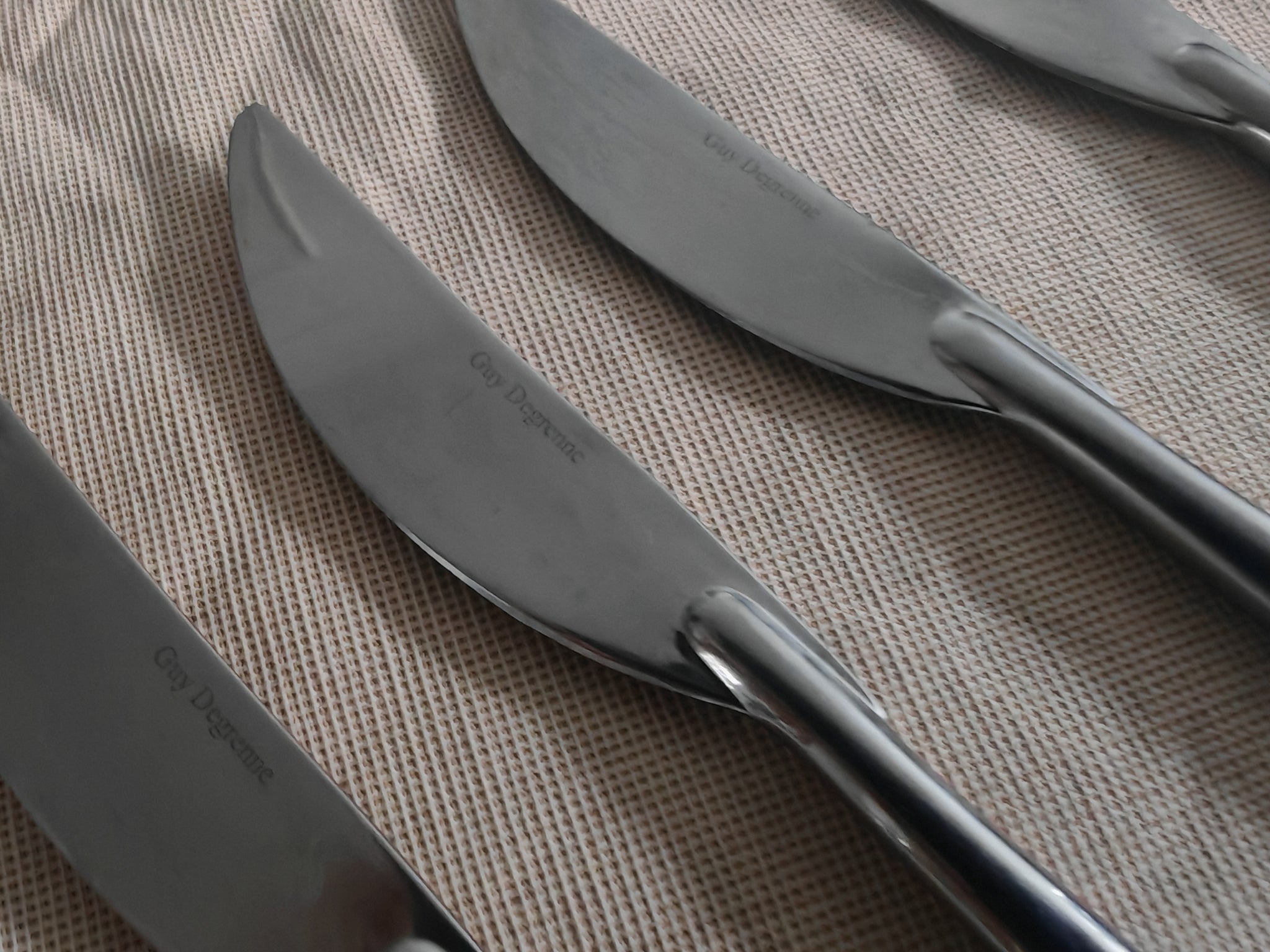 Elevate your dining experience with this elegant set of 6 Guy Degrenne stainless steel dinner knives. Renowned for quality and timeless design, Guy Degrenne cutlery is a staple in fine European dining. These knives feature a sleek, minimalist form with a comfortable grip and gently curved blade—perfect for both everyday use and formal table settings.