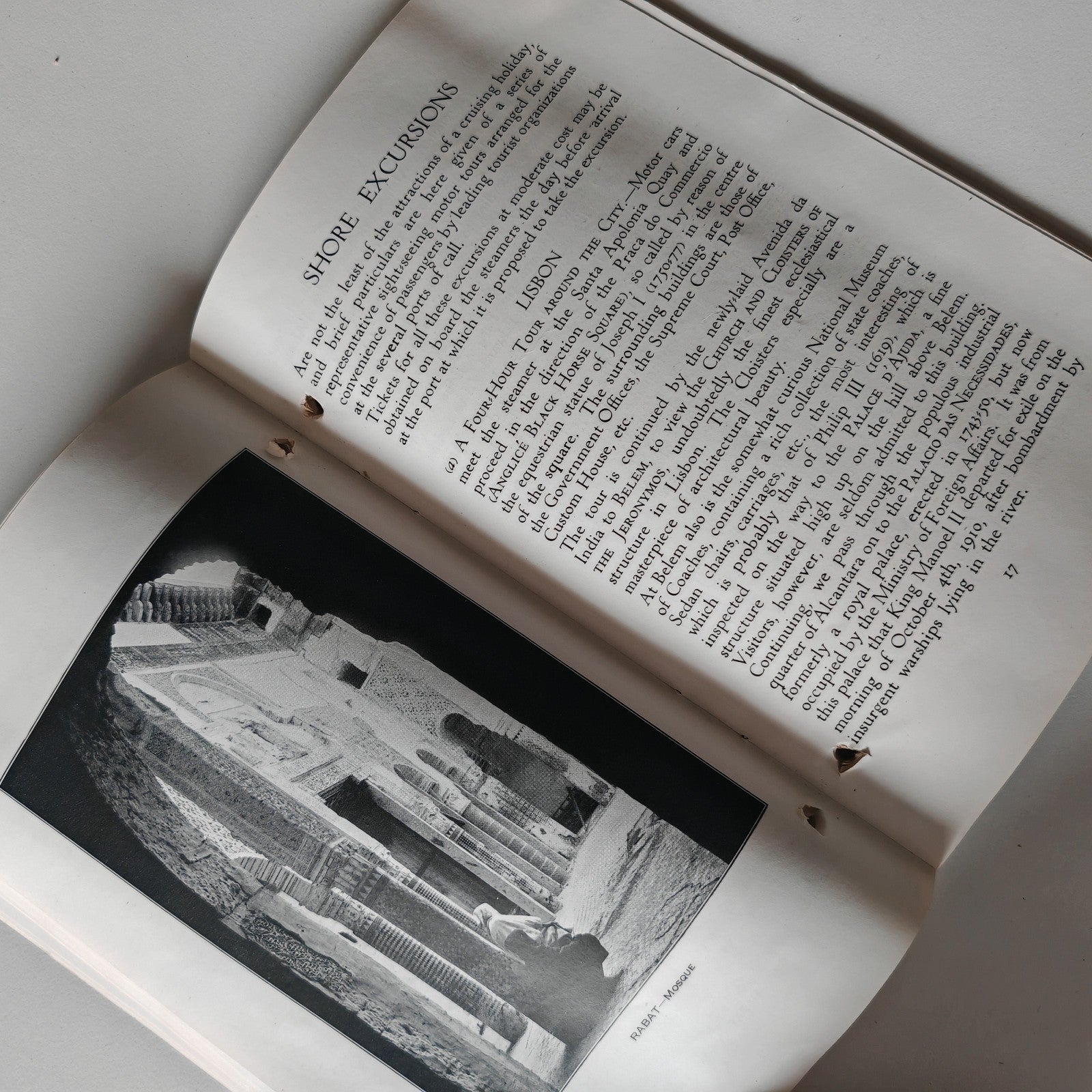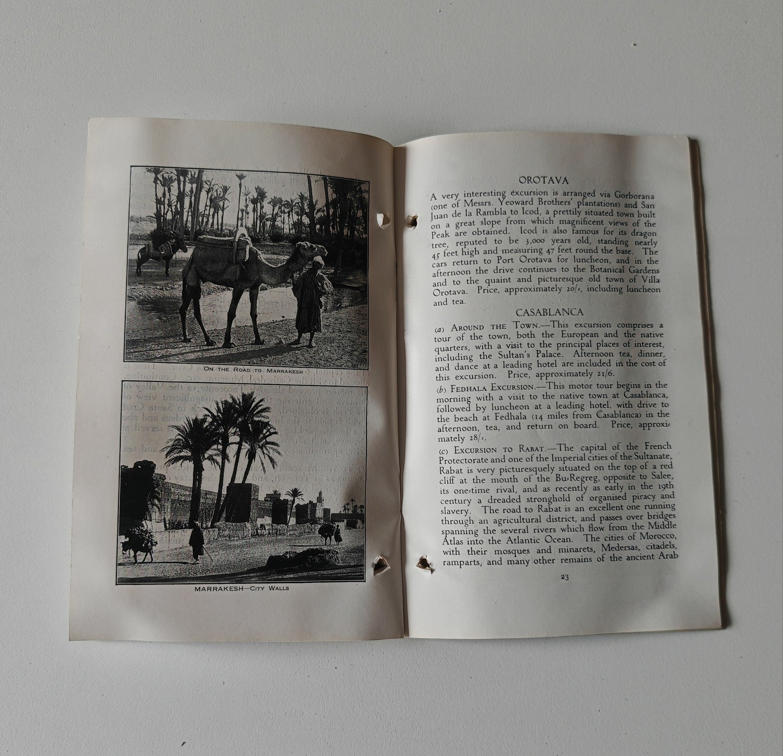with period prices (e.g., “Casablanca Motor Tour… approx. 10/6 including luncheon”) plus advice on tipping, baggage, passports and health formalities.