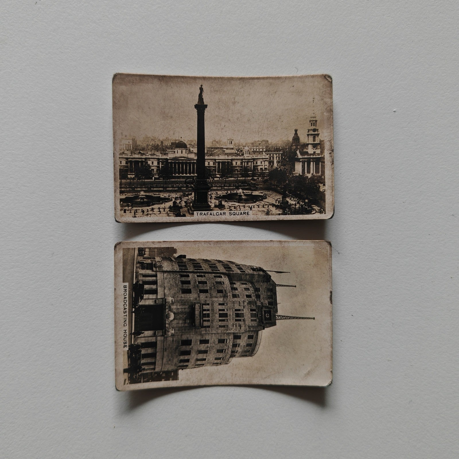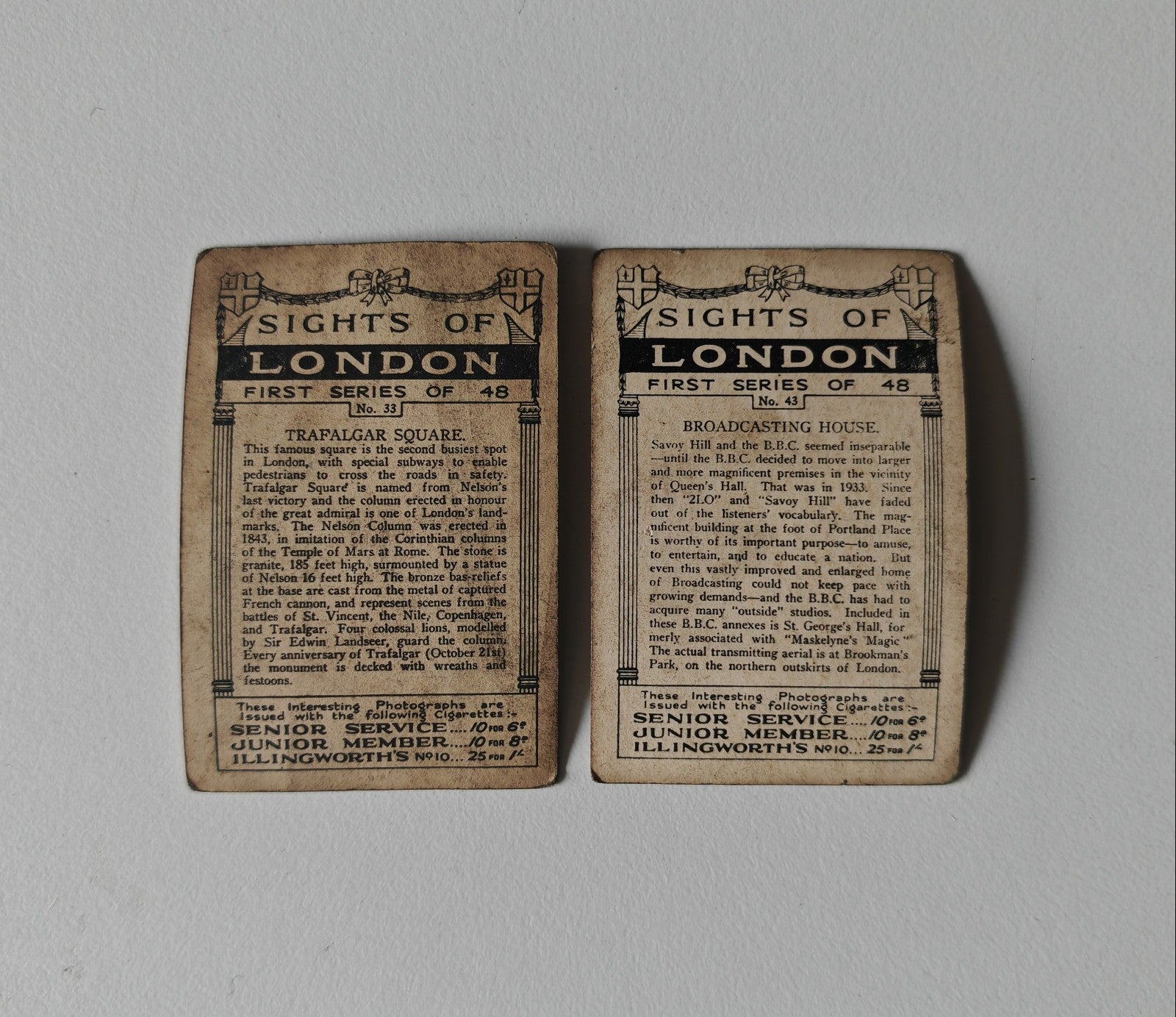 cigarette cards. These vintage cards, issued with Illingworth's and Senior Service cigarettes, showcase detailed sepia-tone photographs of two iconic London landmarks: