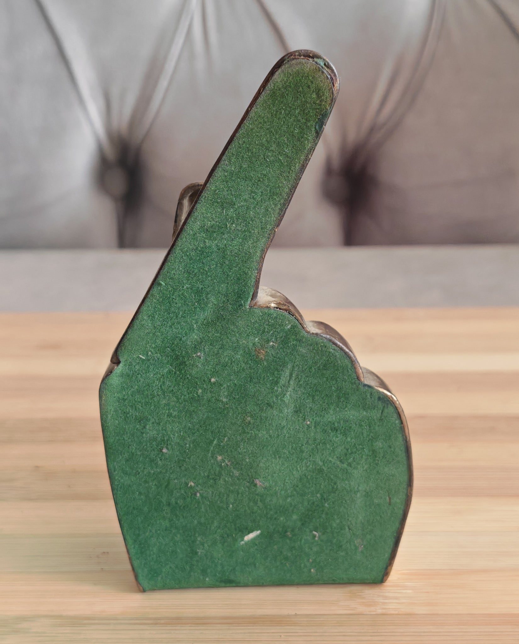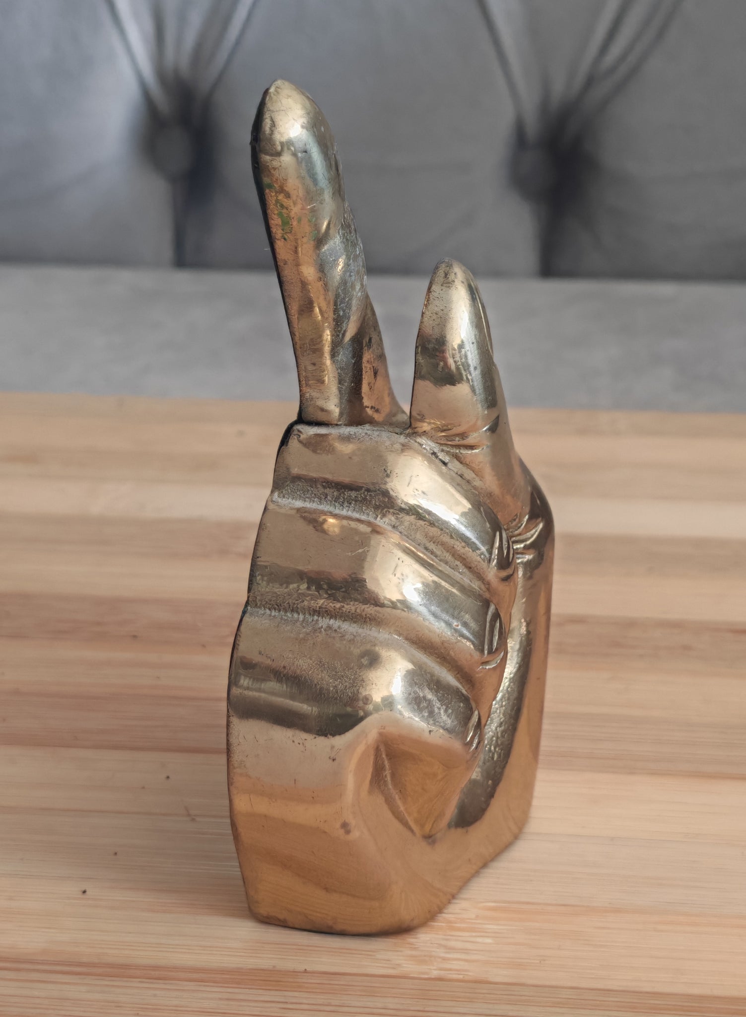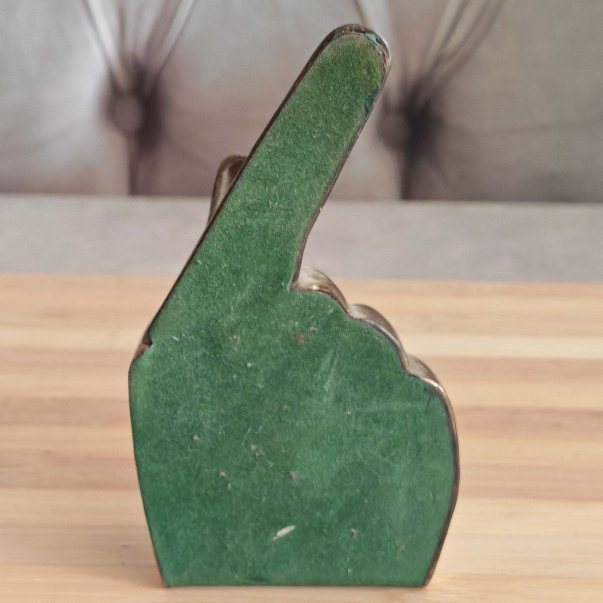 Elevate your dining experience with this charming Brass Hand Napkin Holder. This vintage piece, designed in the shape of a hand giving a peace sign, combines functionality with a decorative flair, making it an excellent addition to any table setting. Its golden brass composition adds a touch of elegance, while its compact size ensures it fits seamlessly on any dining or side table.