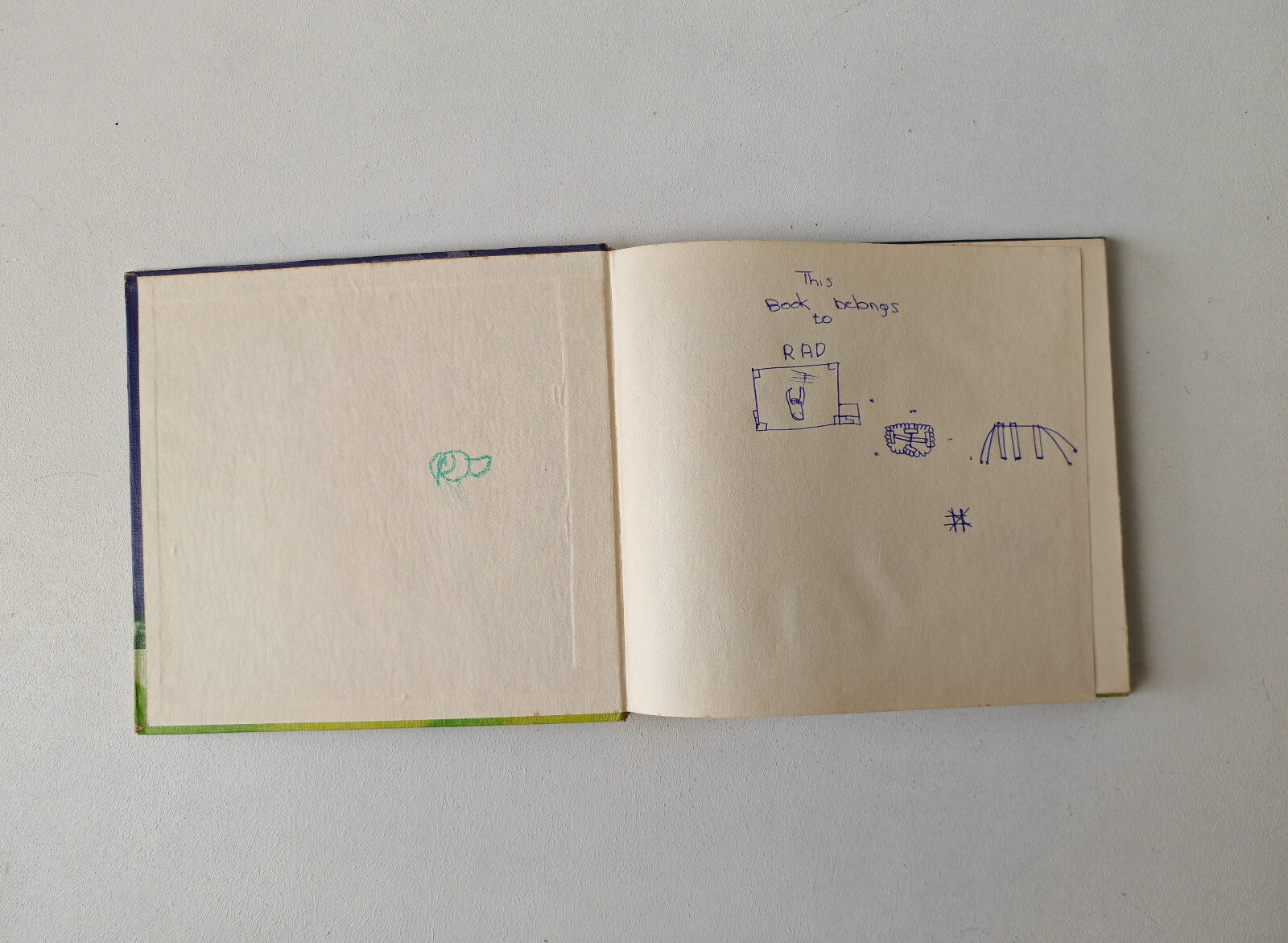 The book shows signs of wear typical for its age, including some discoloration on pages and cover edges. The spine and binding remain intact, ensuring all pages are secure. There are handwritten inscriptions and drawings on the front endpaper, adding a unique personal touch from its previous owners.