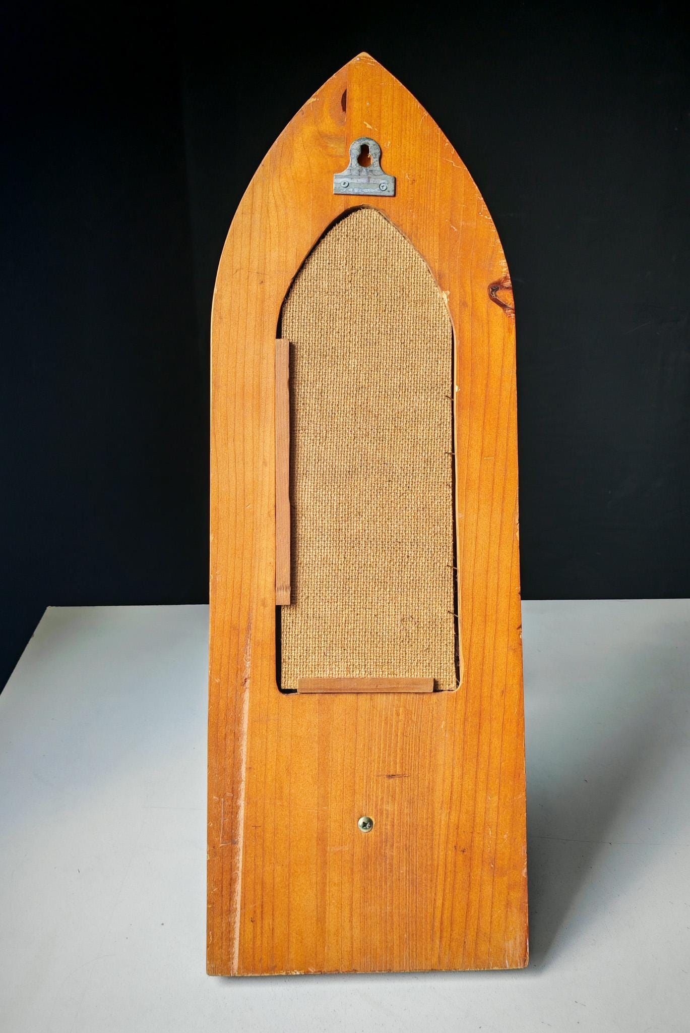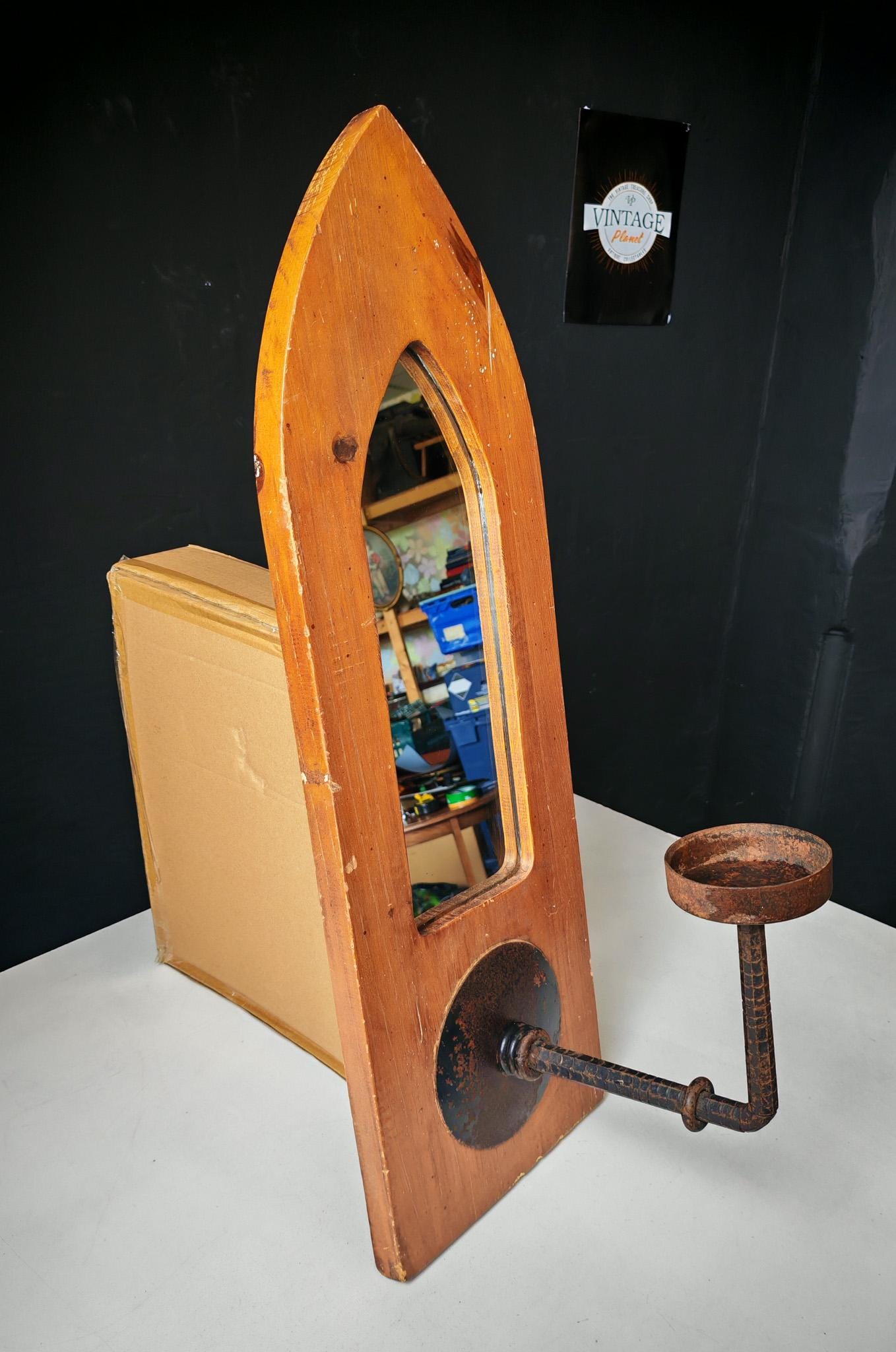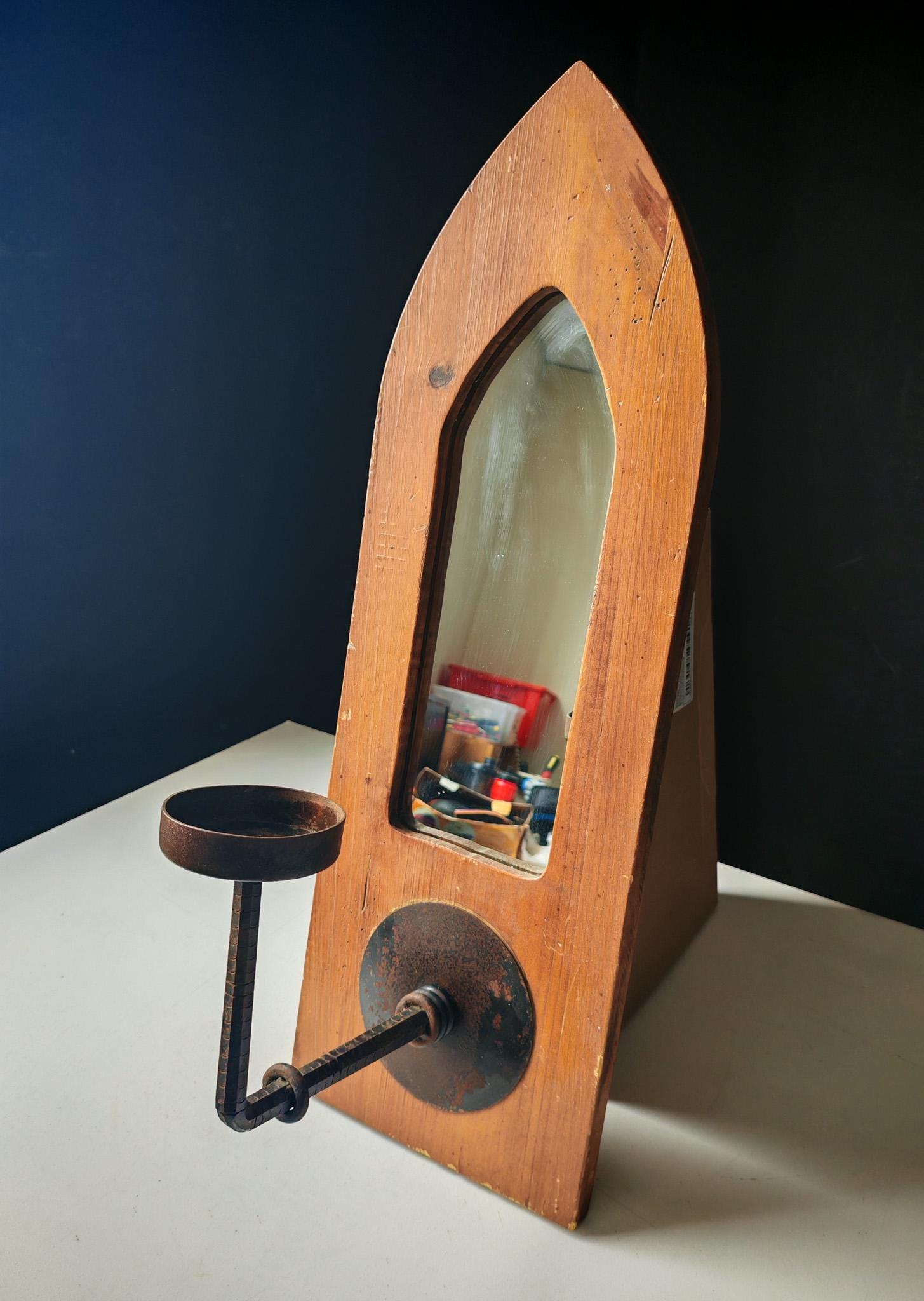 Add vintage charm and moody character to your space with this unique, hand-crafted gothic-style wooden wall mirror featuring an integrated industrial metal candle holder.