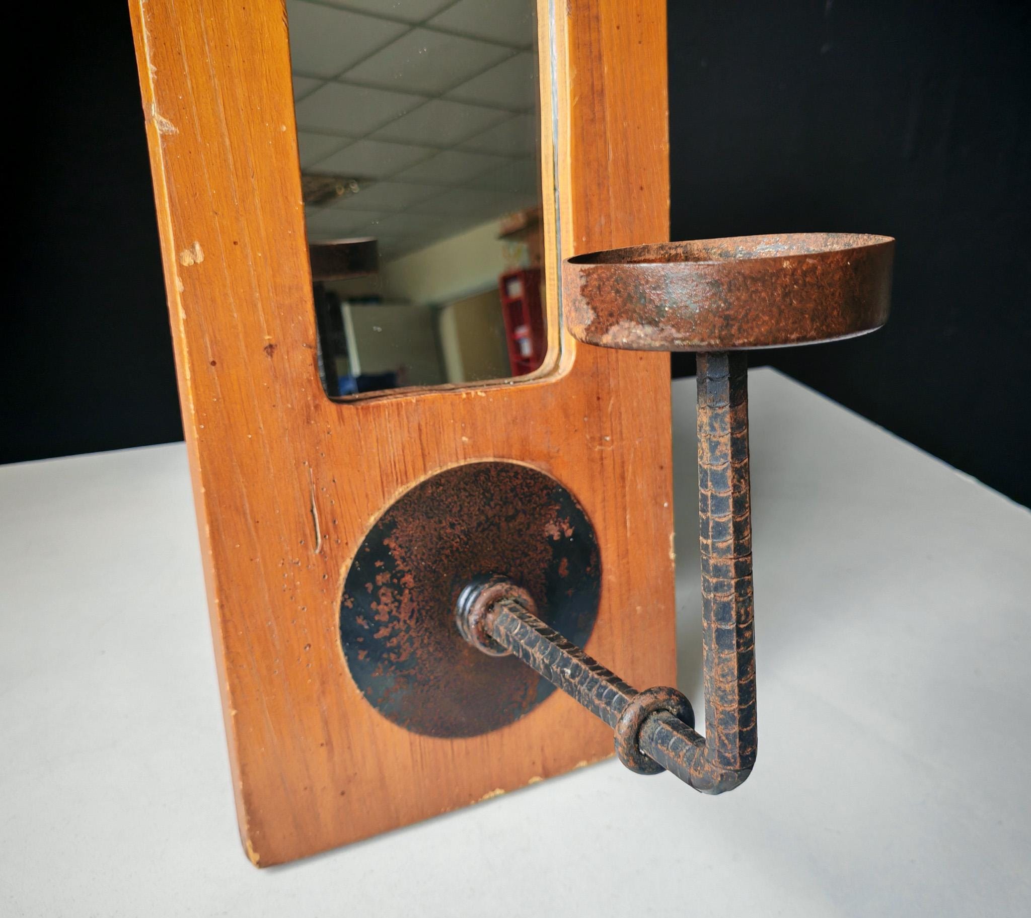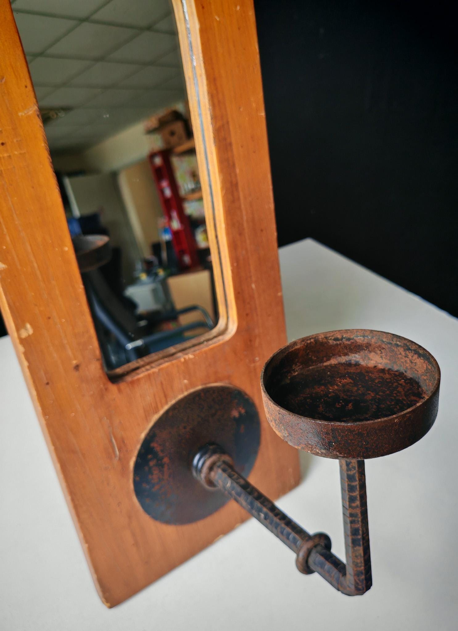 Material: Solid wood with natural grain finish, inset mirror, and heavy-duty rusted metal candle holder