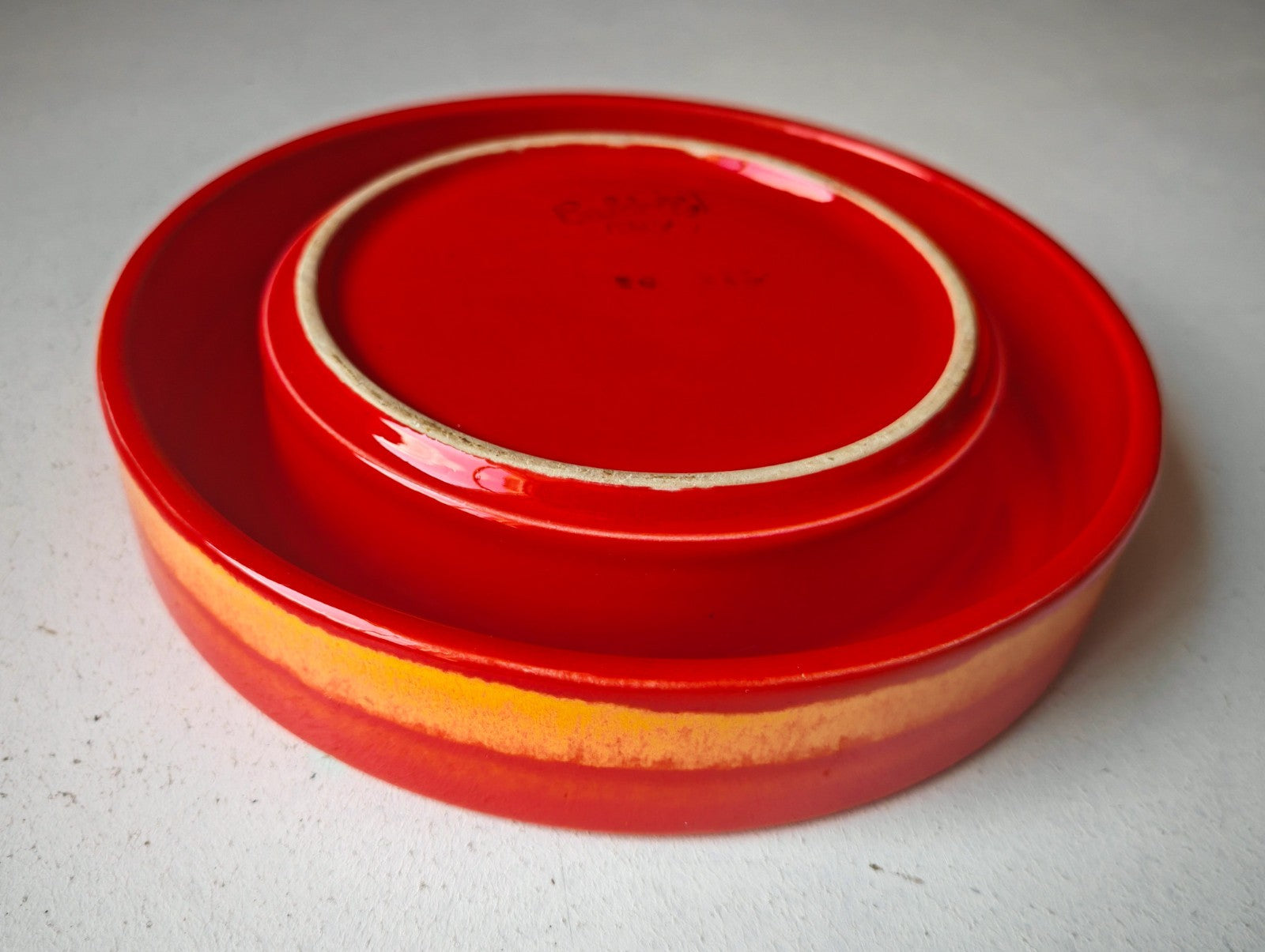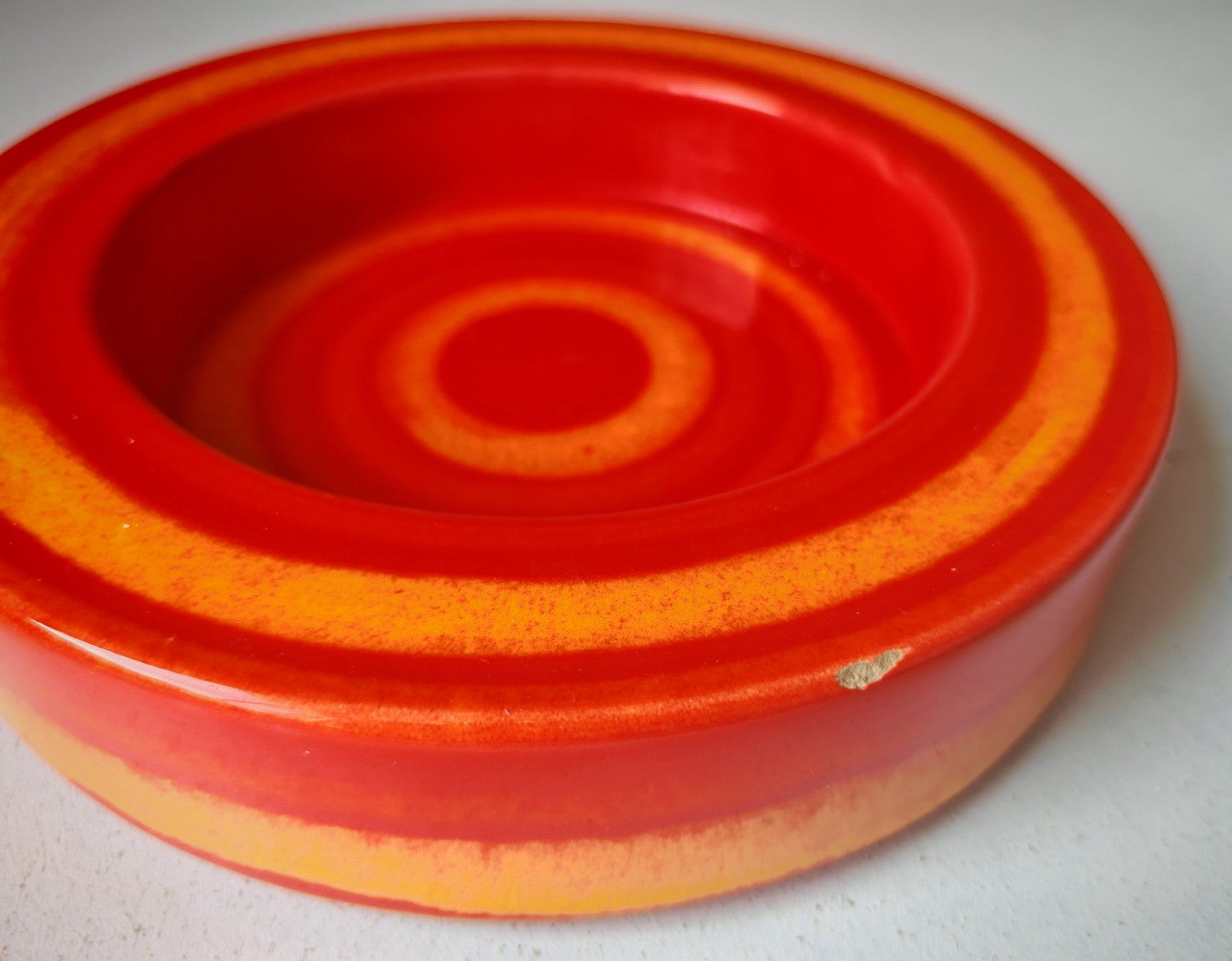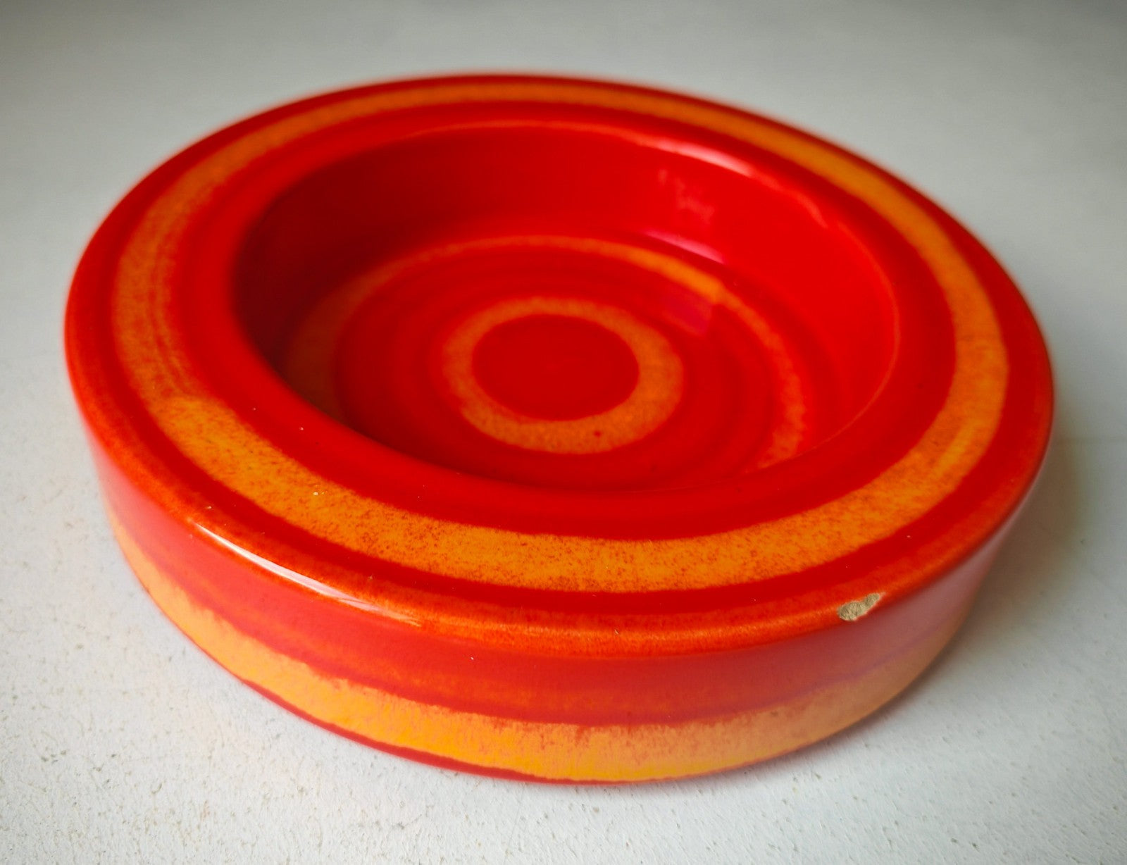 is a beautiful example of bold mid-century studio ceramics. Handmade in Italy, this circular piece features a thick, rounded rim and central well, finished in Baldelli’s signature fiery glaze of glossy red, orange, and yellow rings. Its form allows it to be used as either a decorative bowl or functional ashtray.