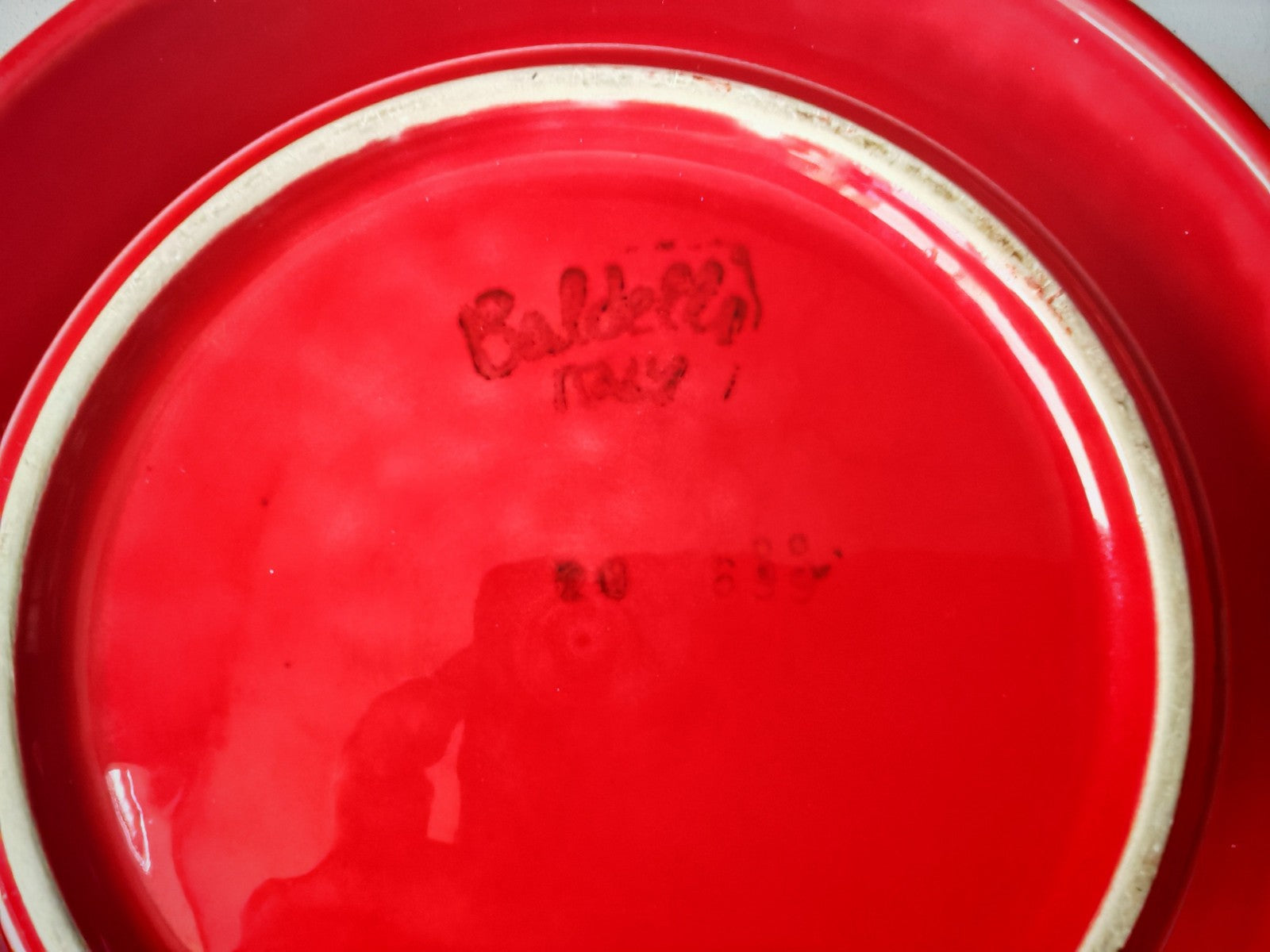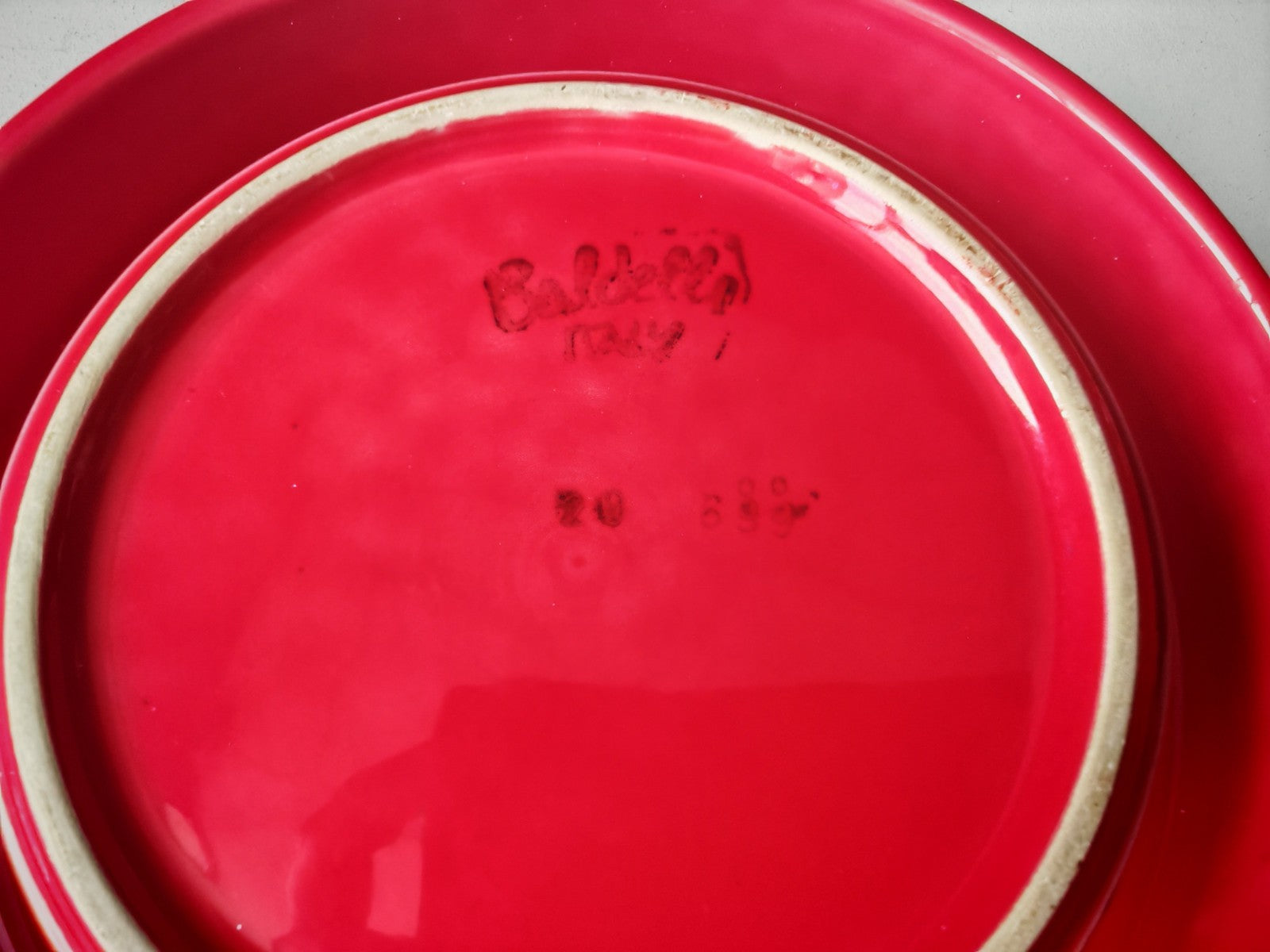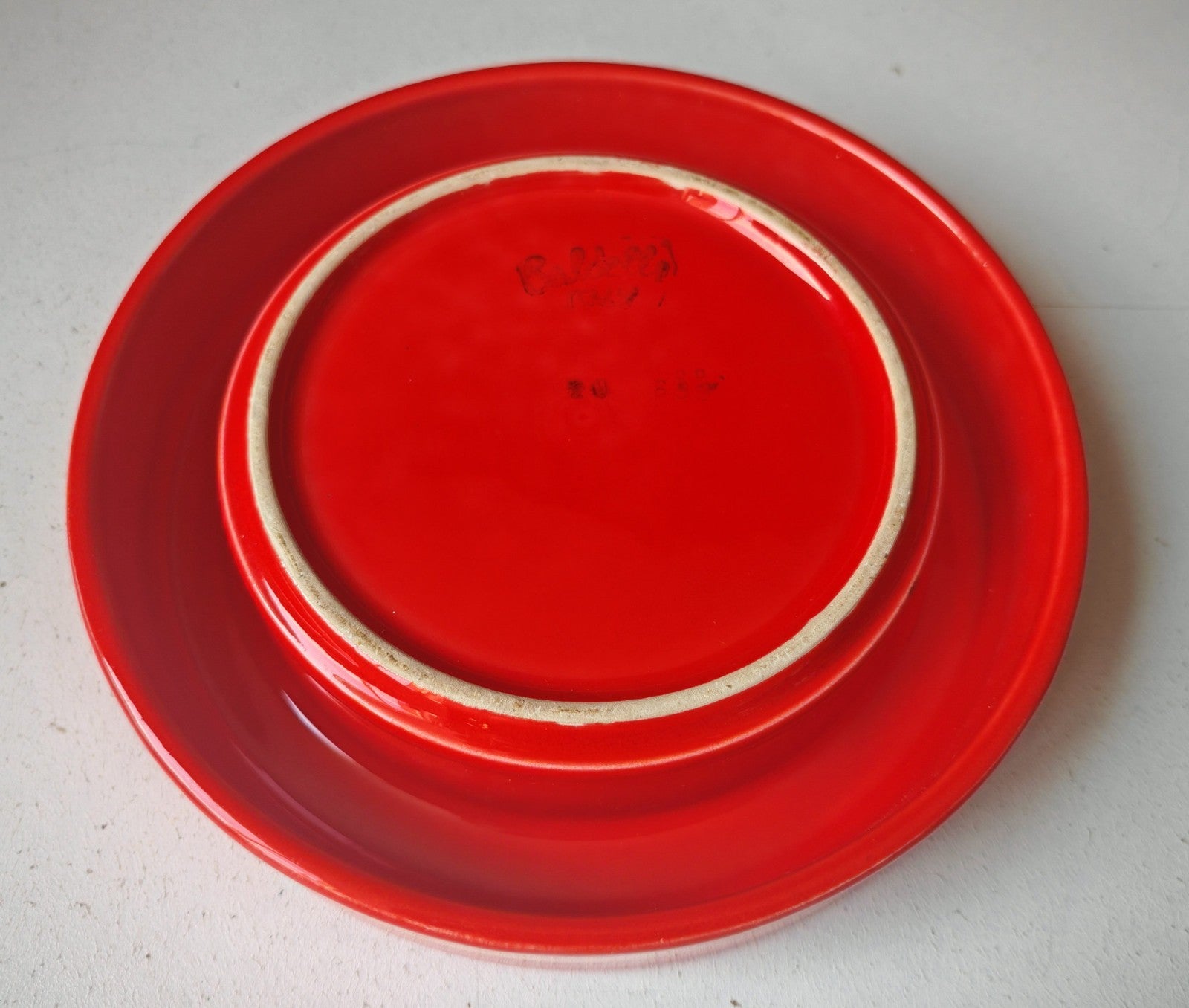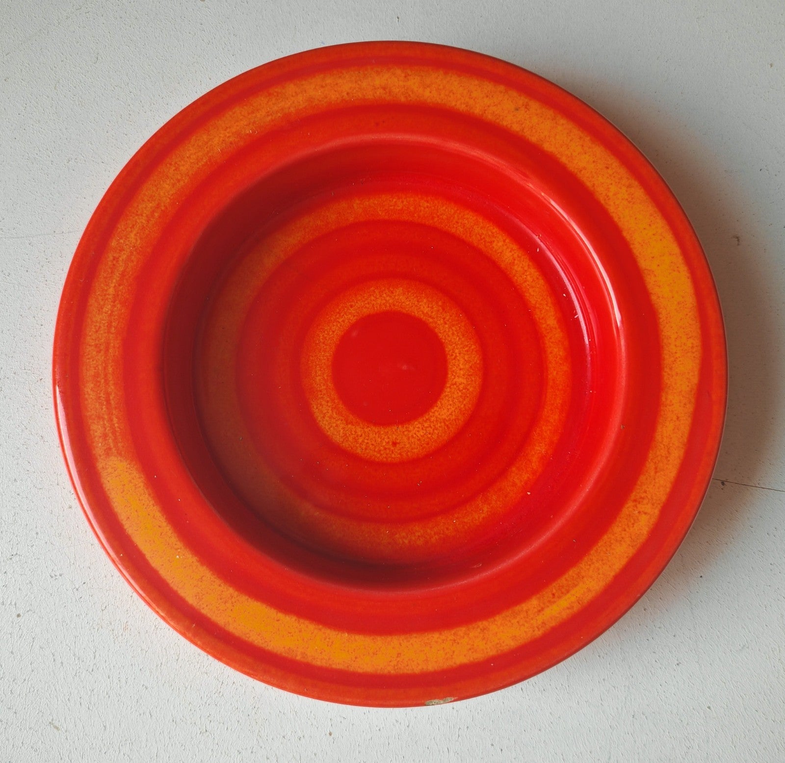 is a beautiful example of bold mid-century studio ceramics. Handmade in Italy, this circular piece features a thick, rounded rim and central well, finished in Baldelli’s signature fiery glaze of glossy red, orange, and yellow rings. Its form allows it to be used as either a decorative bowl or functional ashtray.