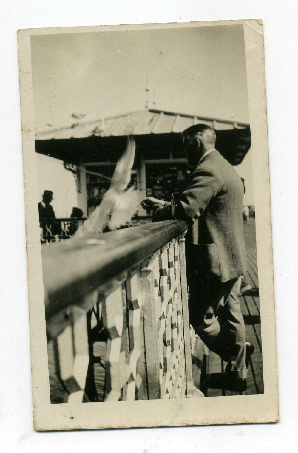 Vintage Black & White Photograph - A smartly dressed man on pier, seagull flying