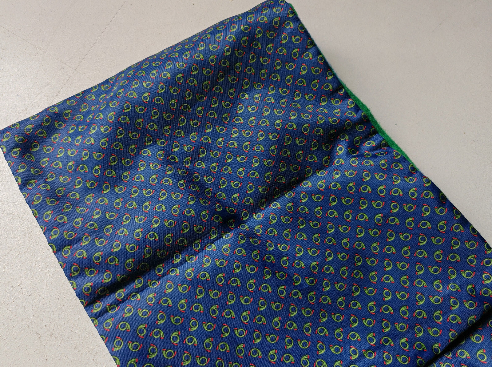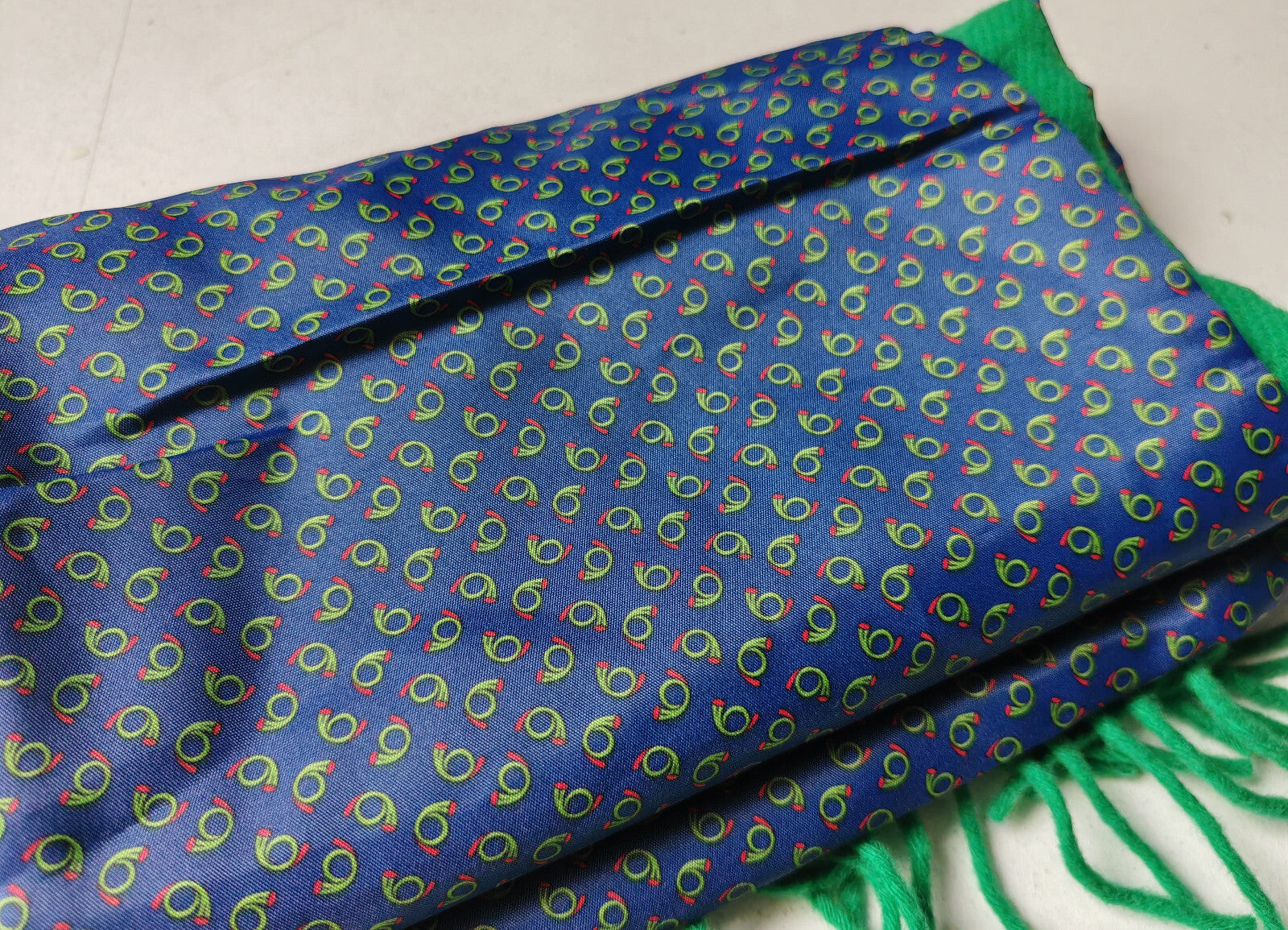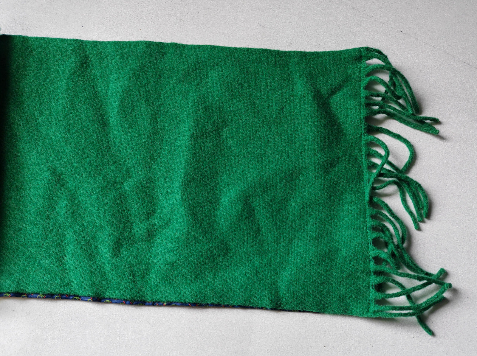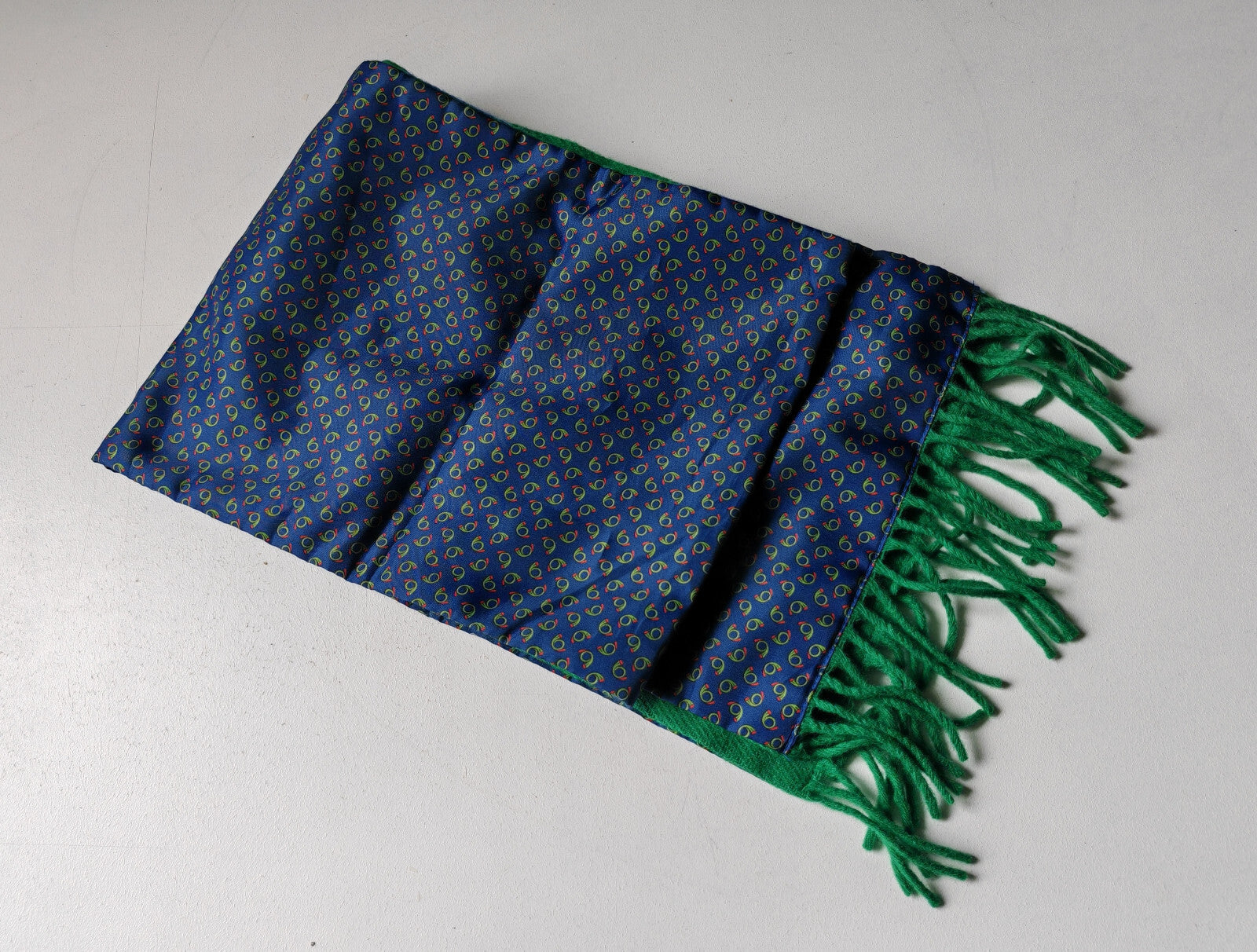 , made in the UK. Featuring a distinctive retro design with a deep navy blue outer patterned in green and red teardrop paisley motifs, paired with a vivid green wool backing and fringe.