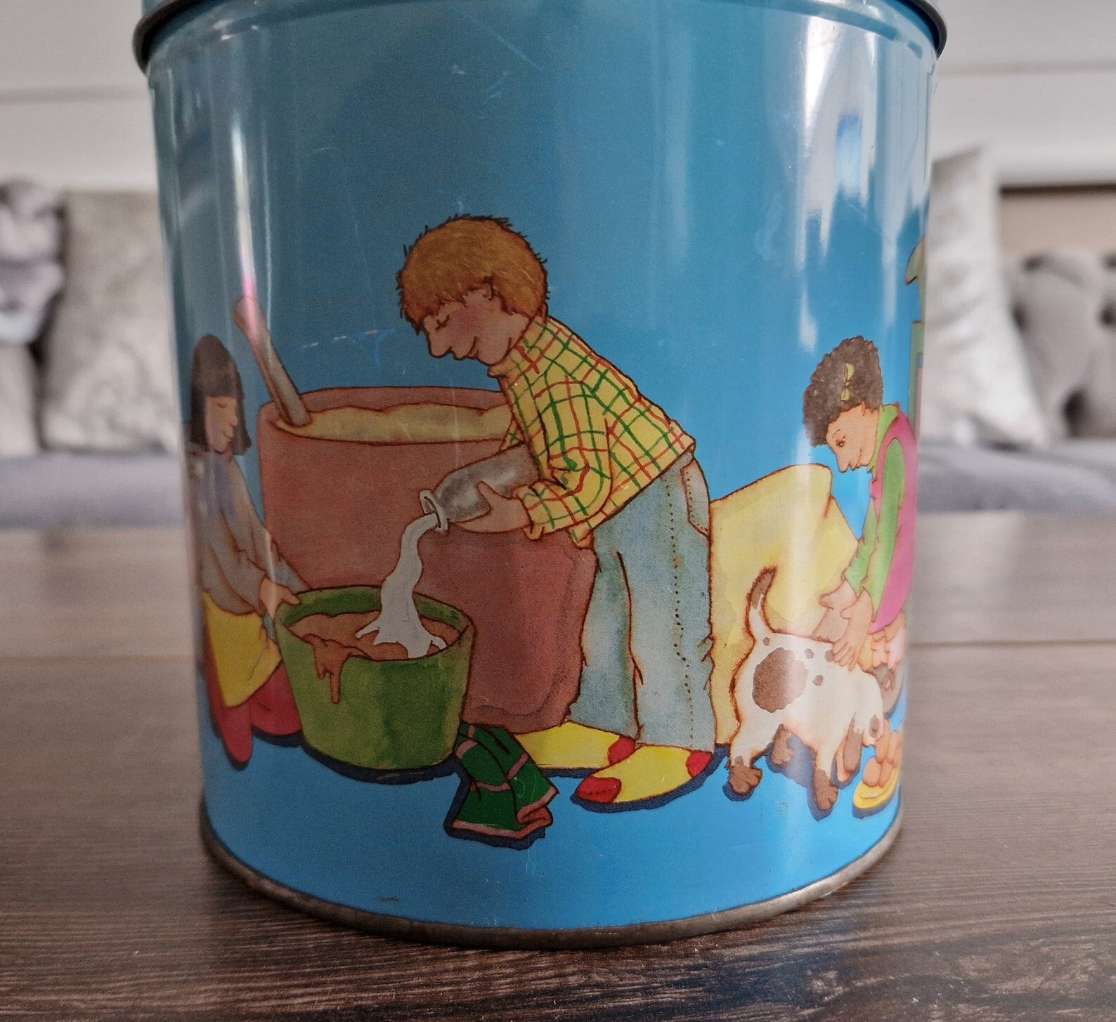 Cute Vintage Children Playing Chef and Baker with Ingredients Blue Tin Metal Canister