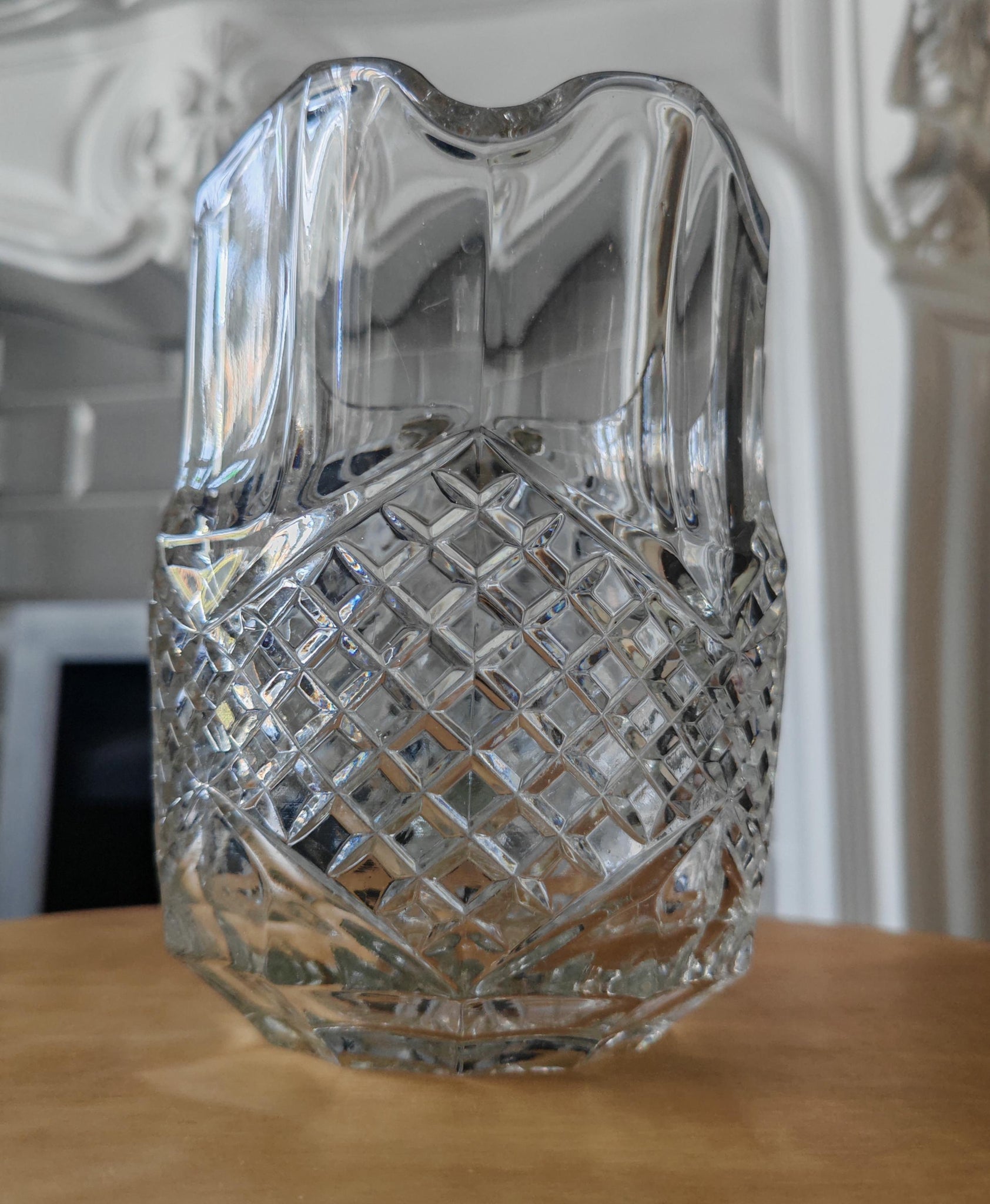 This elegant vintage cut glass jug is a charming example of traditional pressed crystal craftsmanship. Measuring approximately 16cm tall, it features a bold crosshatch diamond pattern and a striking starburst base, ideal for serving water, juice, or as a stylish floral vase.