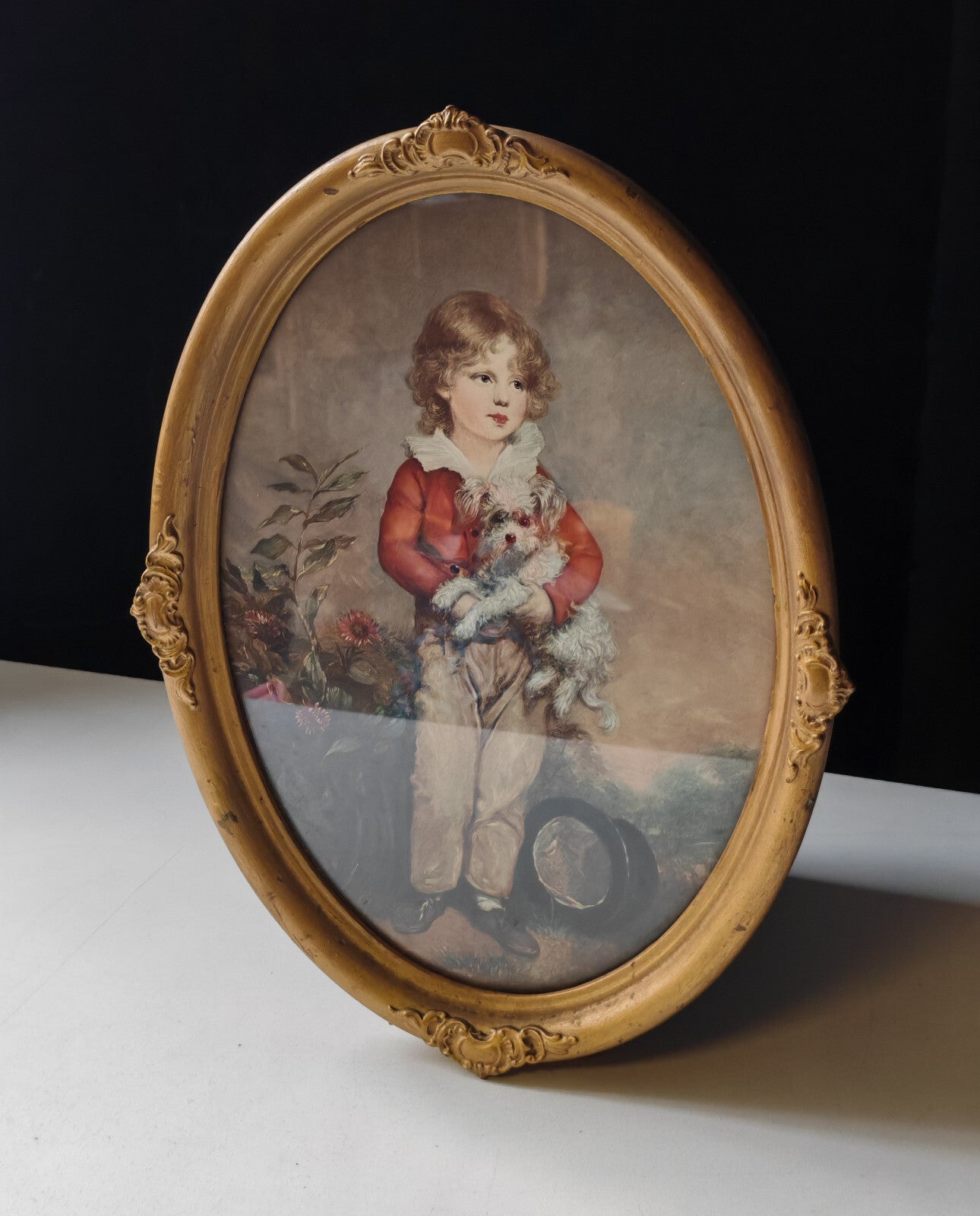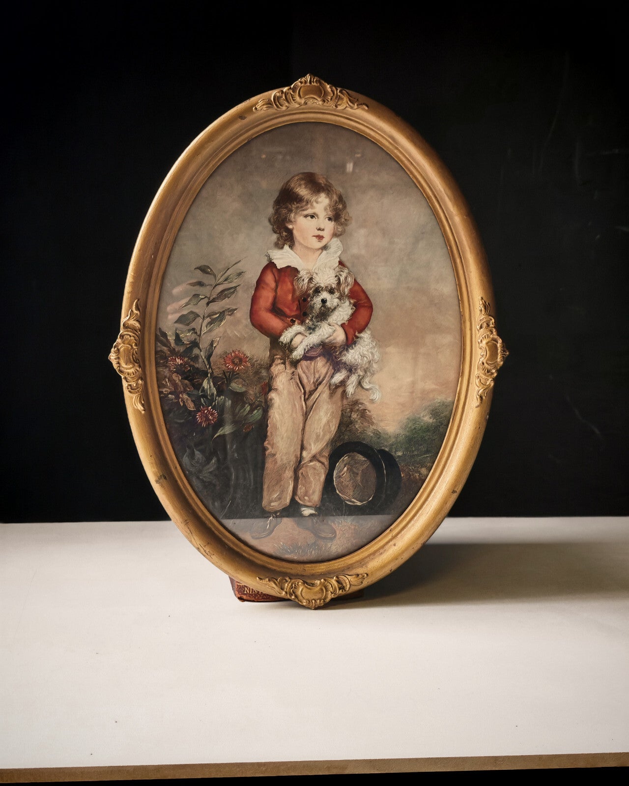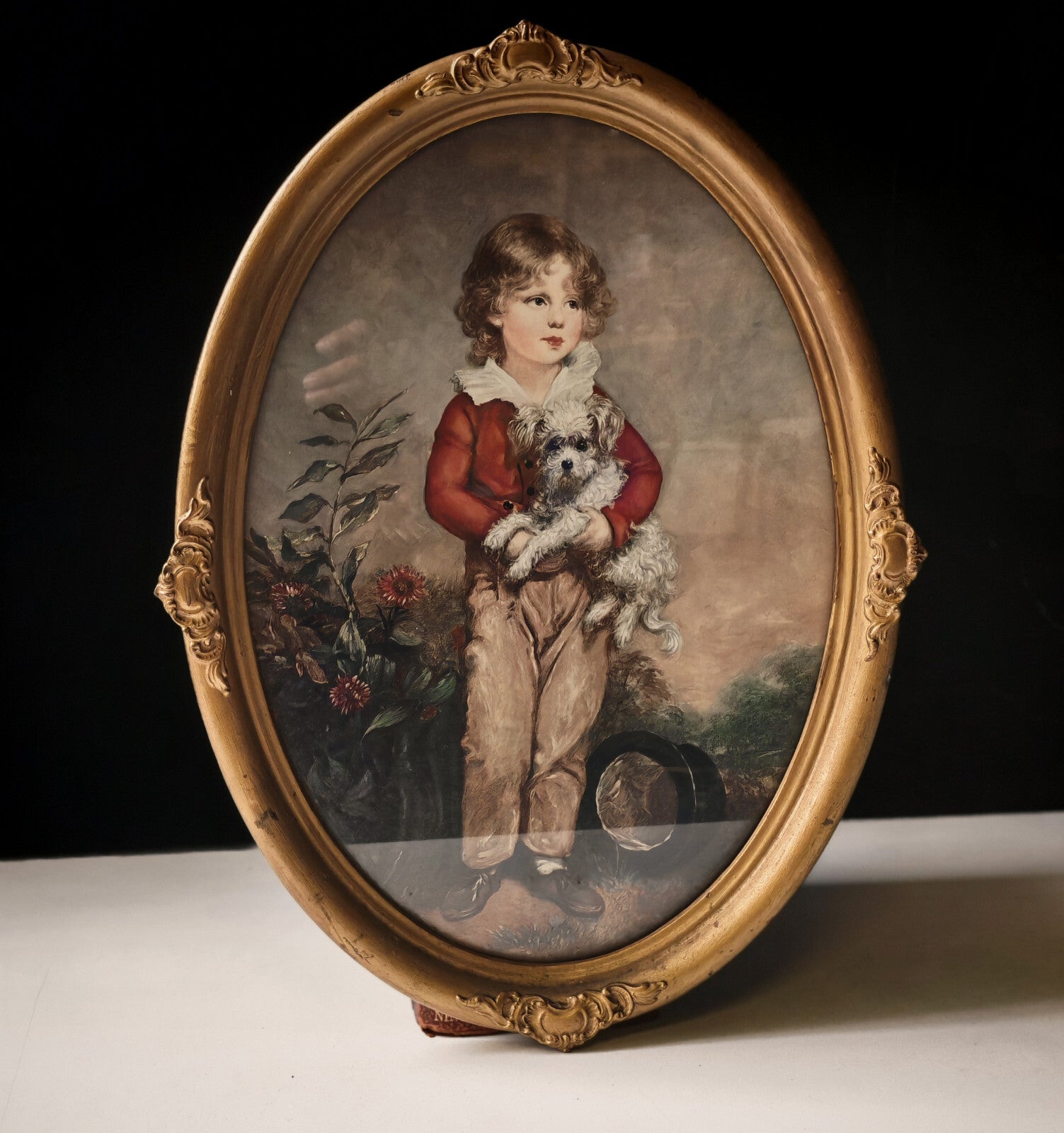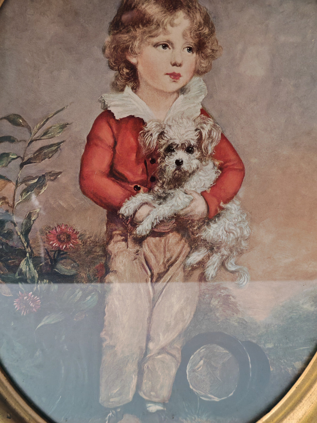 (1712–1787), known for his elegant Georgian portraiture. This piece features a young boy in a red jacket, tenderly holding a small white dog, surrounded by soft floral detailing and natural tones. Housed in an