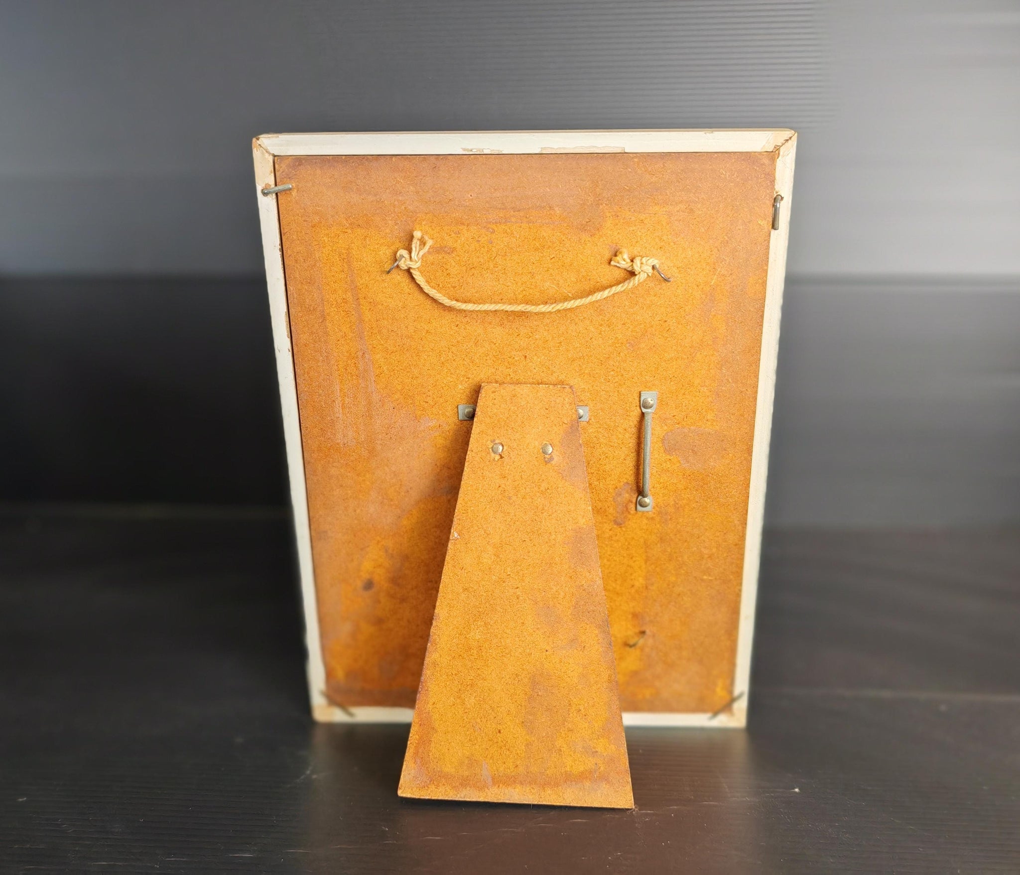 The back of the frame has a rustic, aged look, with a stand and hanging cord intact (see photos for details).