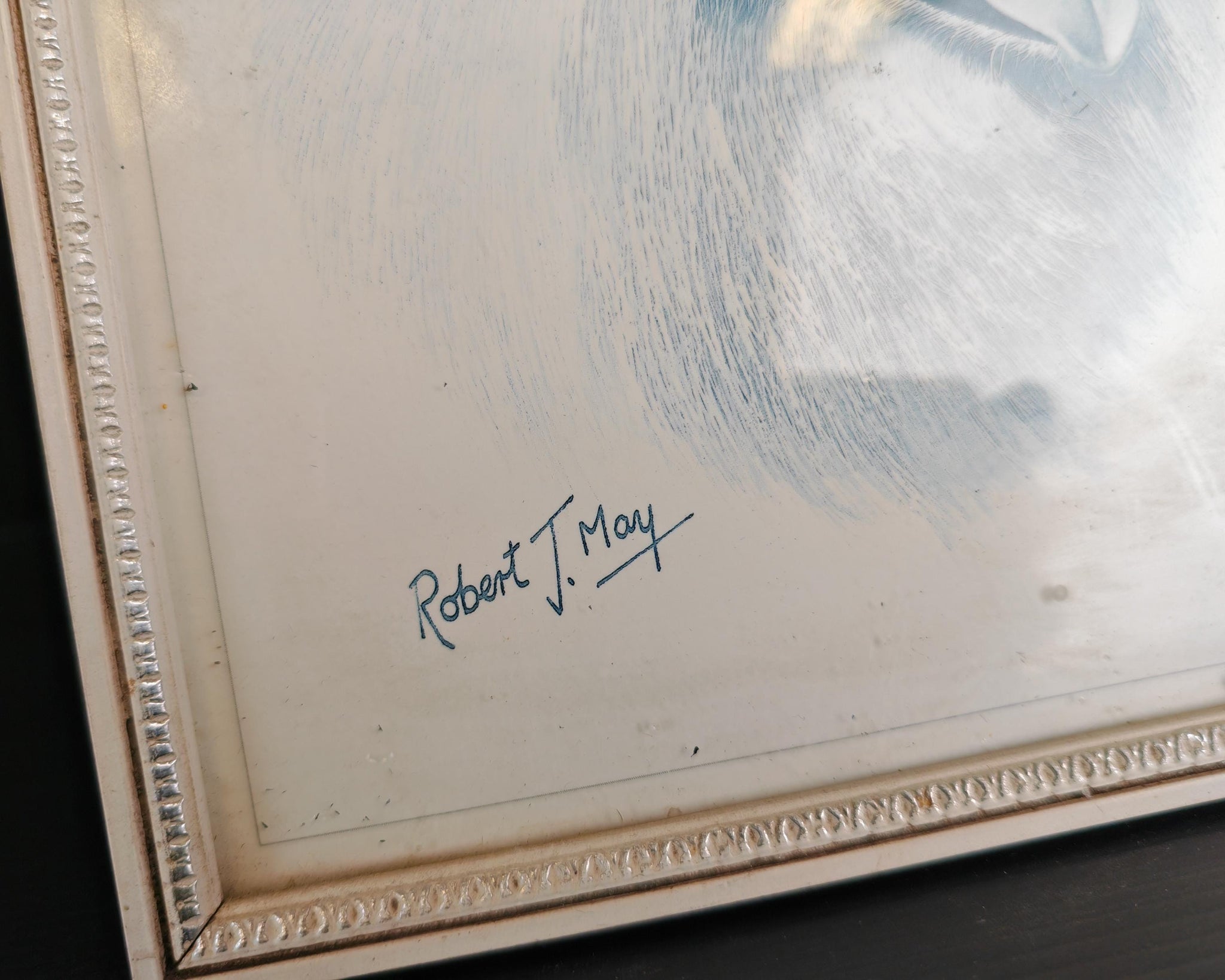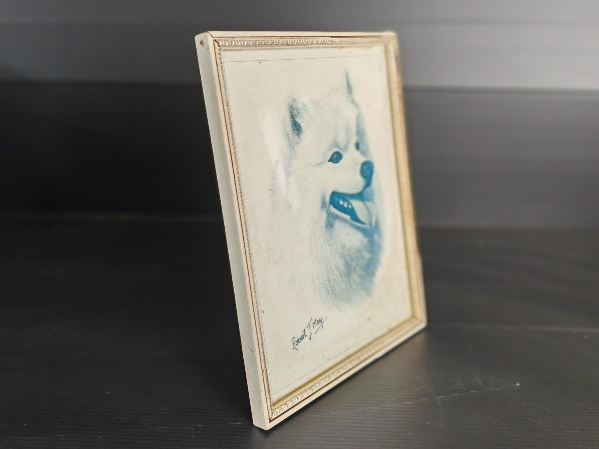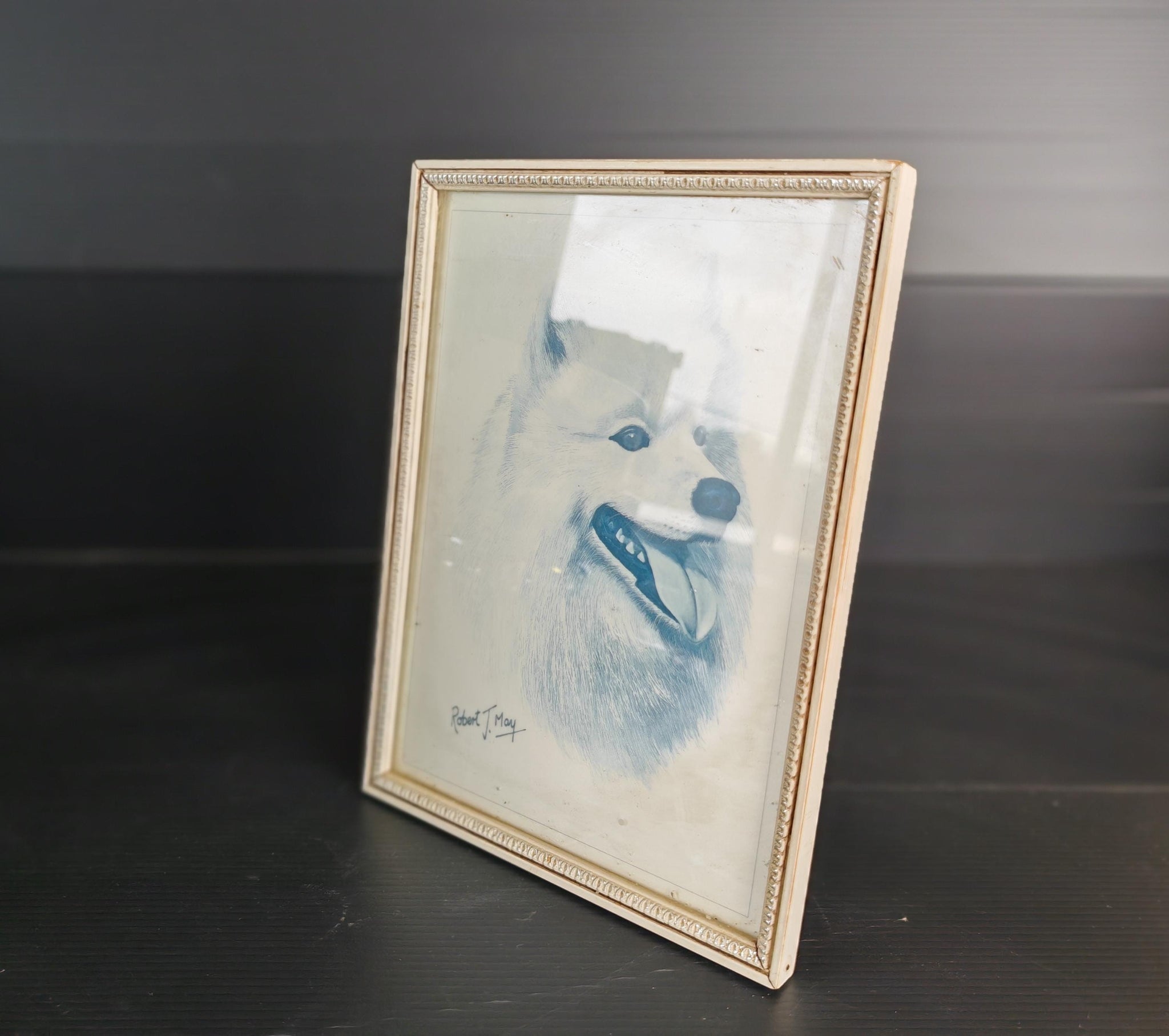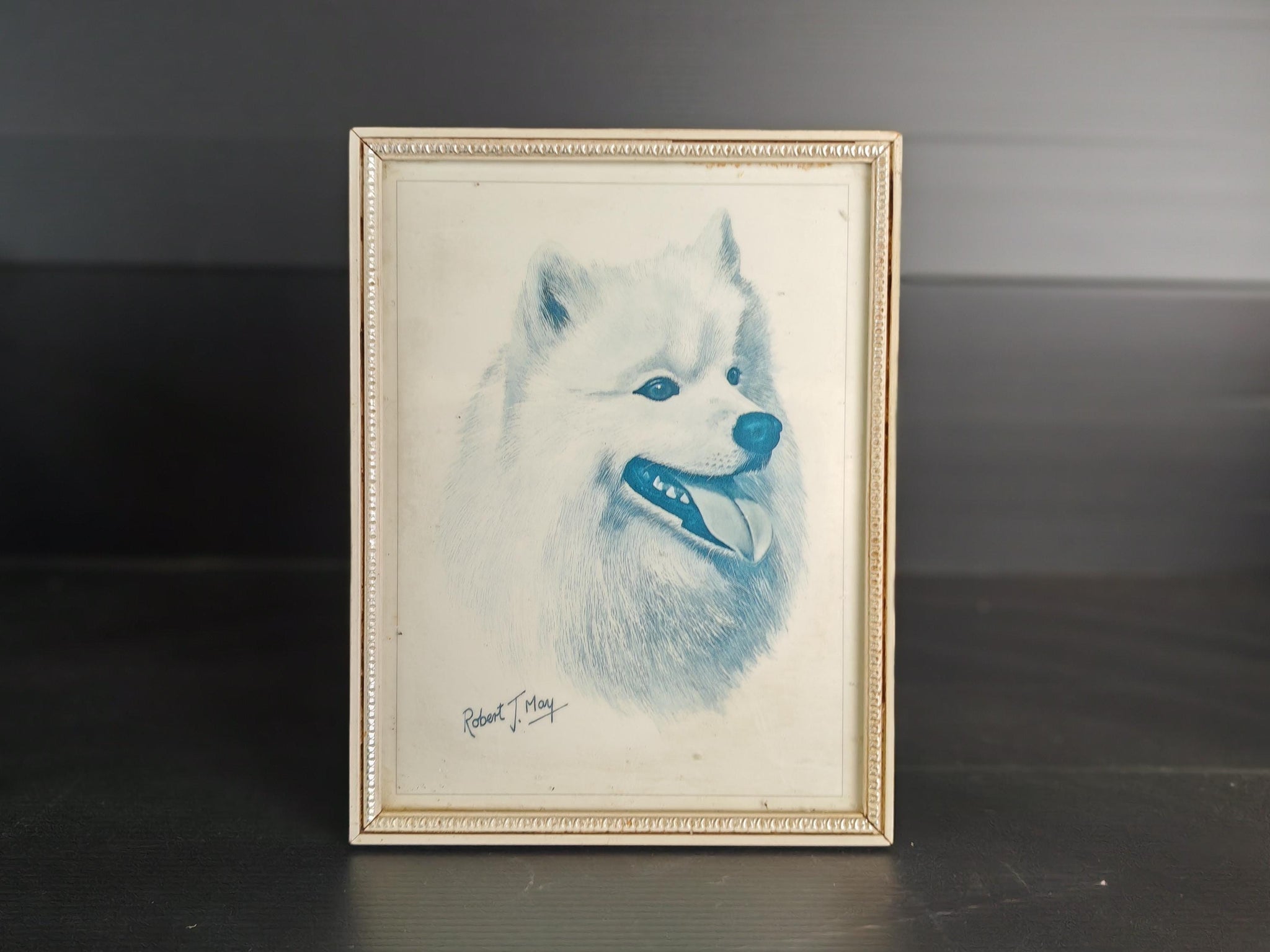 A beautiful vintage framed print of a Samoyed dog, illustrated by Robert J. May. This striking blue-toned artwork captures the dog's friendly and fluffy appearance in fine detail. The print is housed in an elegant vintage gold-tone frame with a decorative border. The artwork is behind glass, preserving its delicate details.