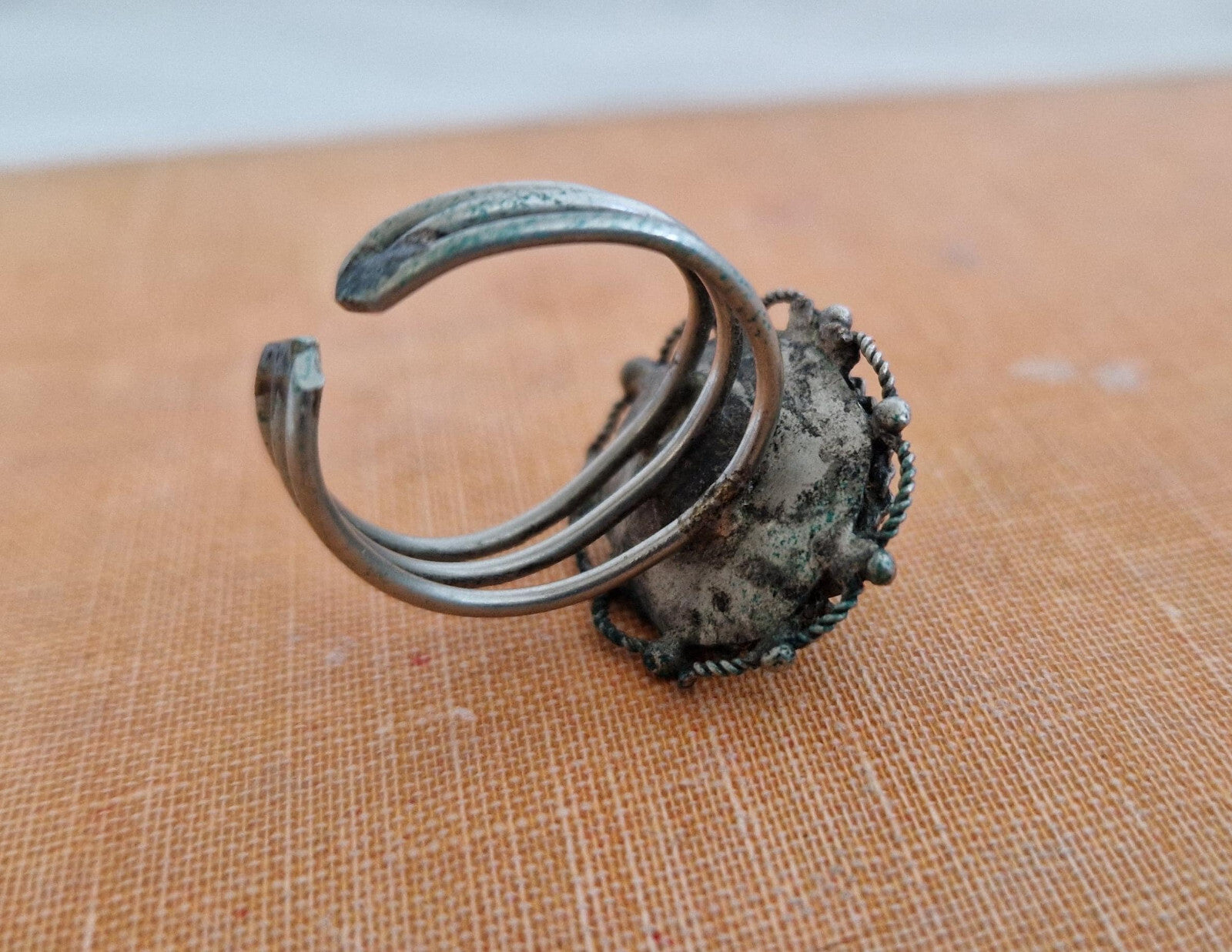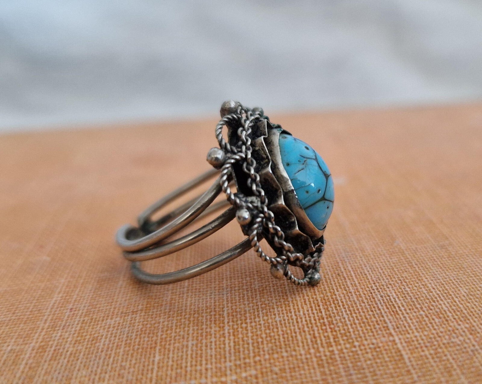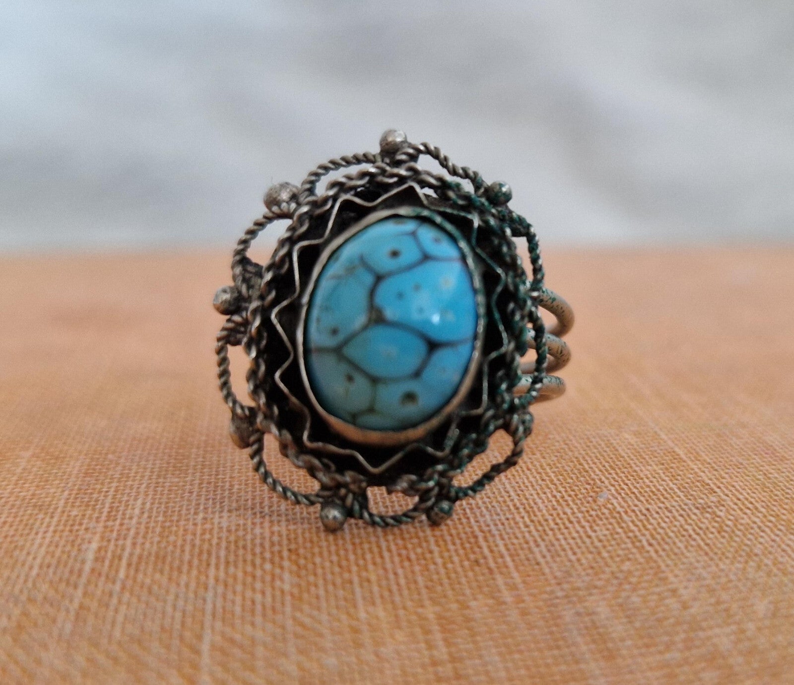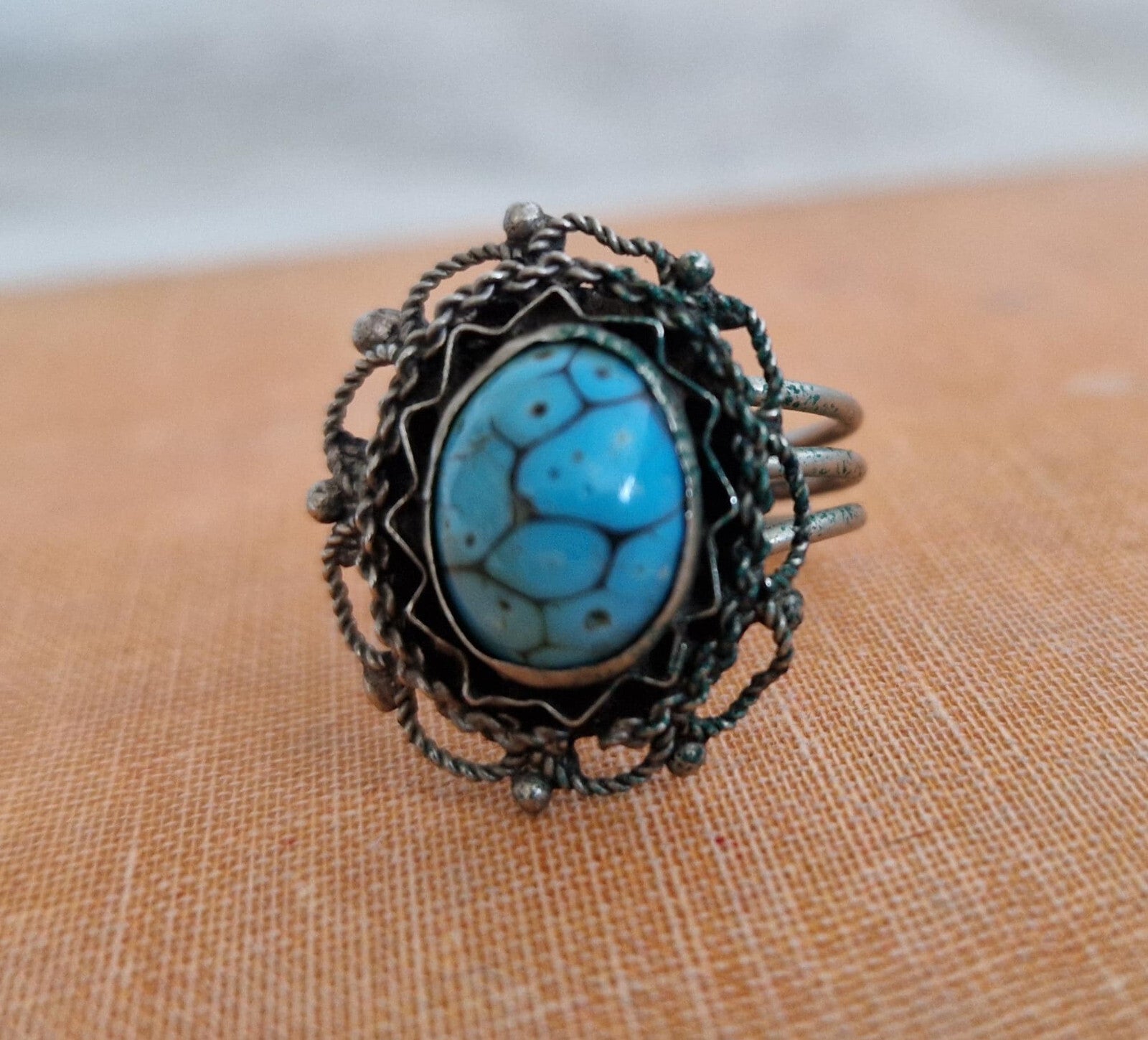Lovely vintage southwestern style metal and round central turquoise stone ring.