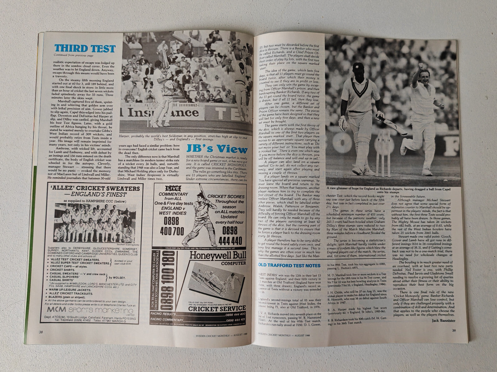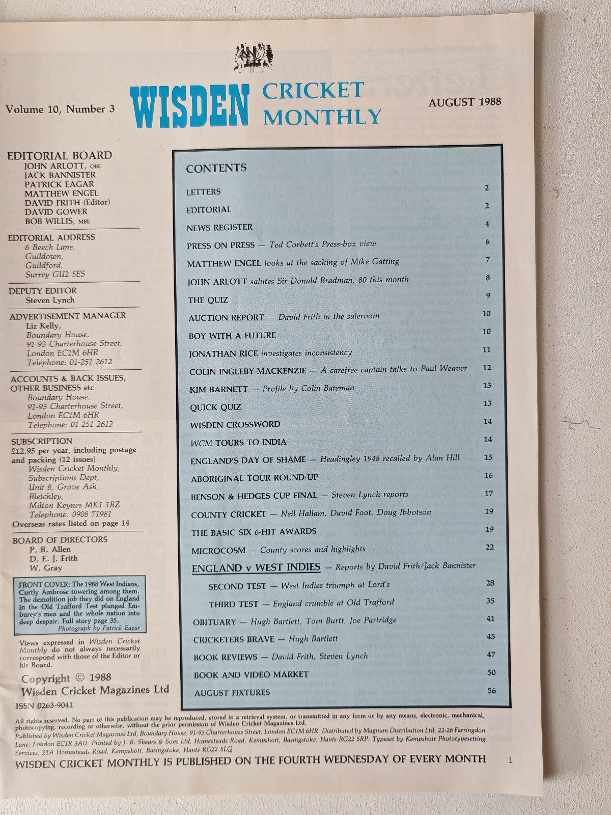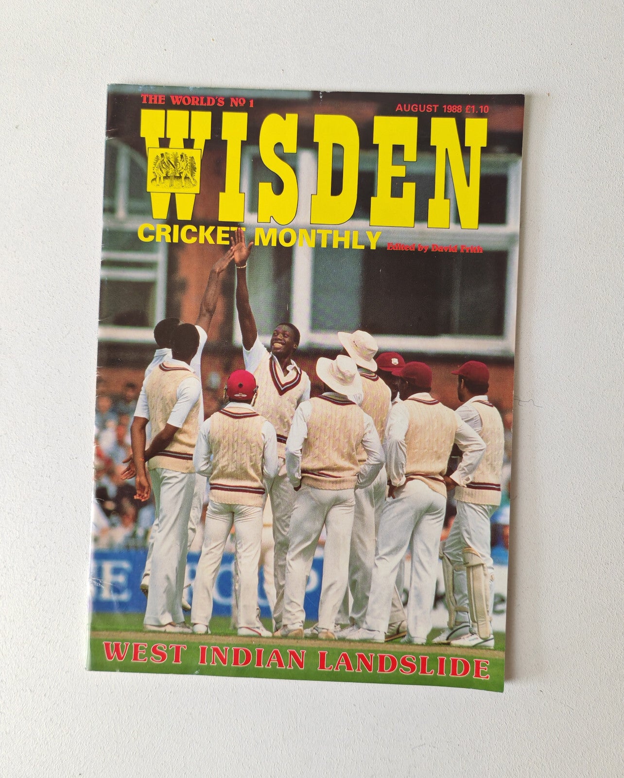 Offered for sale is the August 1988 issue of Wisden Cricket Monthly, featuring the headline story "West Indian Landslide." This issue provides an in-depth look at the cricket scene with articles, analyses, and coverage of the West Indies tour and other key cricketing events.